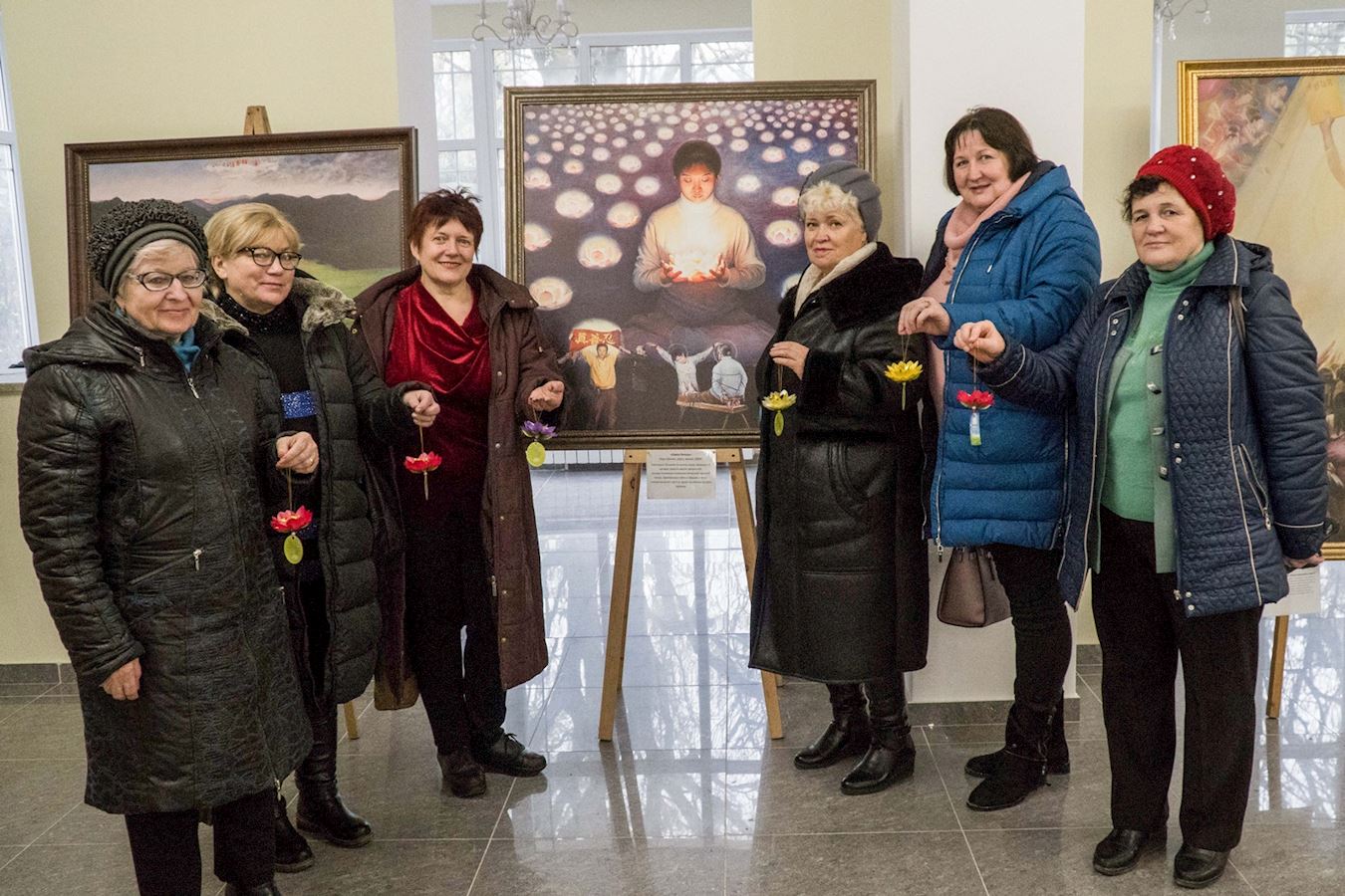 '图1:观看画展的俄罗斯民众手持纸莲花和法轮功学员创作的画合影'
