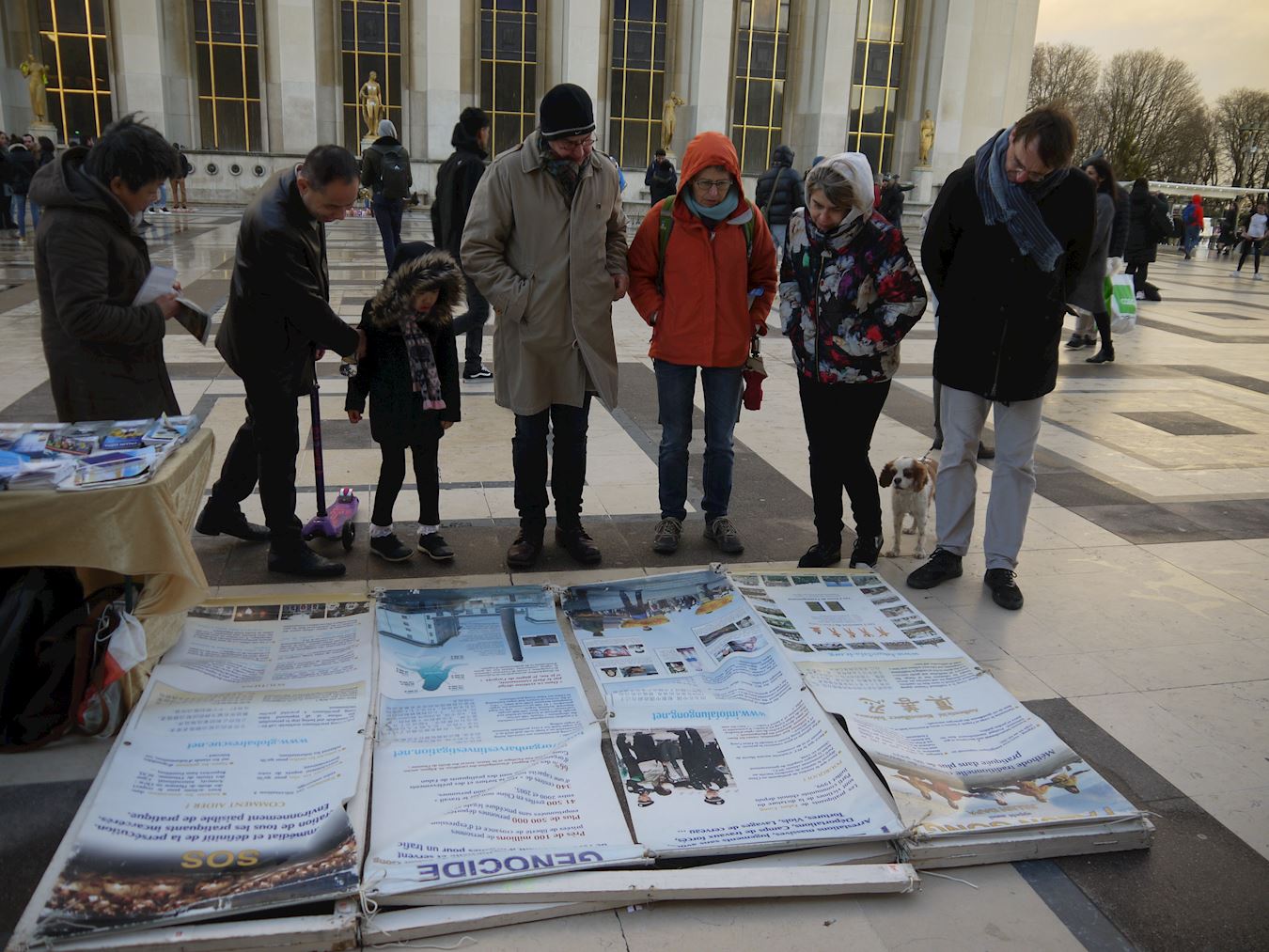 ![]() 图1~2:二零一八年十二月九日下午,在巴黎人权广场,游人阅读法轮功真相展板 |