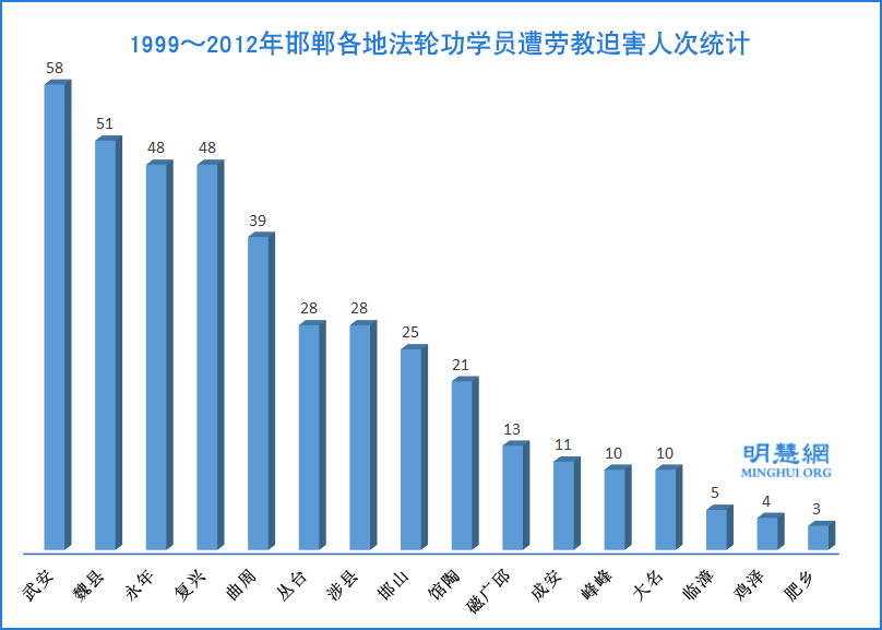 ![]() 图:1999~2012年邯郸各地区法轮功学员遭劳教迫害人次统计。 [注]:中共劳教制度于2013年解体。 |