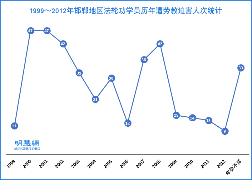 ![]() 图:1999~2012年邯郸地区法轮功学员历年遭劳教迫害人次统计 [注]:中共劳教制度于2013年解体。 |