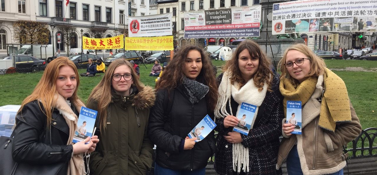 Elli和Delyan以及她们的同事们,在法轮功活动场地了解到中共迫害法轮功的迫害事实,他们拿取了资料,并表示:“活摘器官很恐怖,我们支持你们去制止这个恶行。”