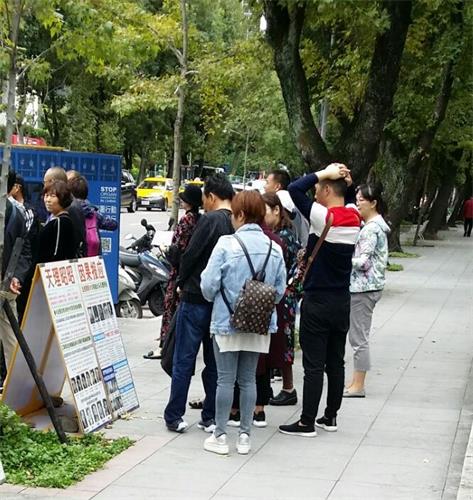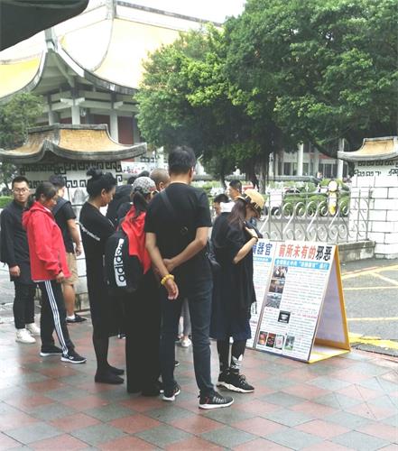 有位导游在带团进入国父纪念馆正馆参观交接典礼后,走回到真相点对学员说:“刚刚带团经过时,你们不是跟我们打招呼吗?有位游客马上问了:法轮功不是违法的吗?在这里政府不抓吗?”