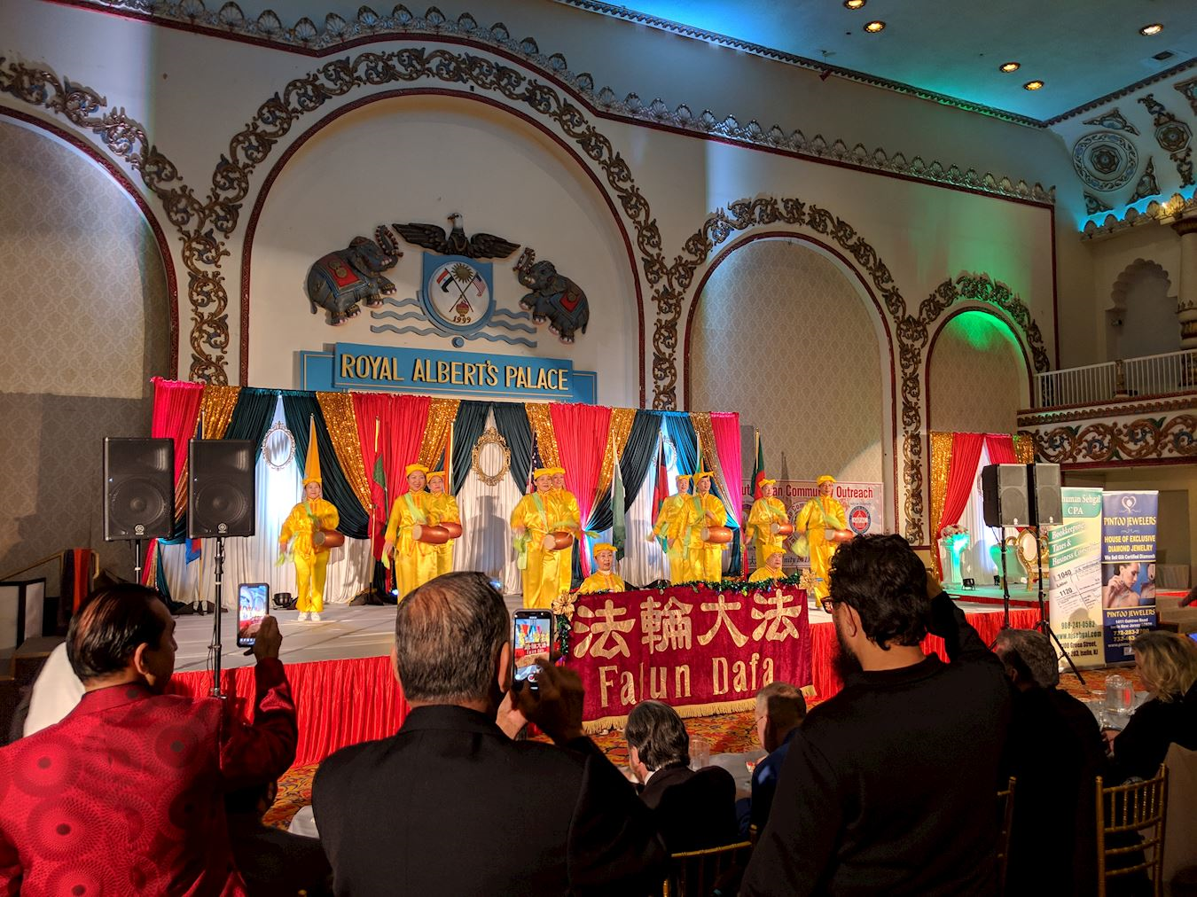 豪华的大厅点缀着节庆的装饰,人们身穿盛装,现场音乐欢快,充满喜庆的气氛。活动上 ,主持人在台上宣布:“下面是法轮大法修炼者为我们进行腰鼓表演,这是来自中国的古老传统。”