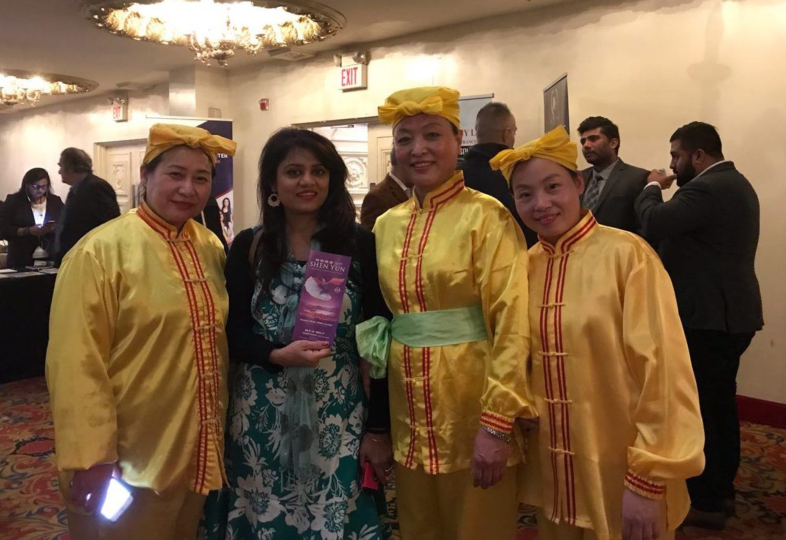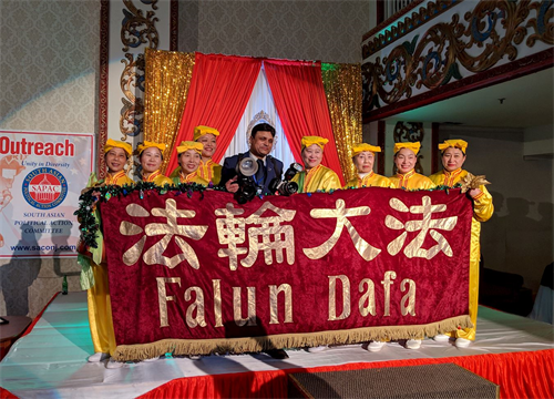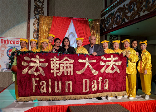 【明慧网二零一八年十二月二十二日】二零一八年十二月十九日晚,美国南亚社区外展组织在新泽西Royal Albert's Palace隆重举办圣诞庆祝活动。纽约法轮功学员组成的腰鼓队应邀登台表演,精彩的演出受到各族裔人士欢迎,被纷纷邀请合影留念。