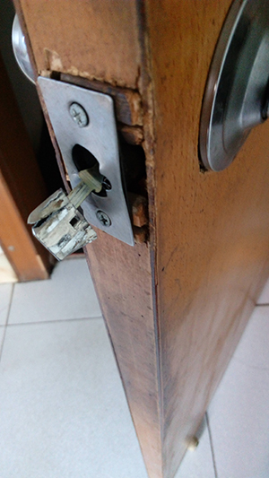 这些人不由分说就直冲到后面的房间,对锁着的房门用脚猛蹬,锁头被蹬坏(过后自己花了四十元换了一个新锁),非法冲进房间抢下挂在墙上的大法师父法像和门上的三张福字。