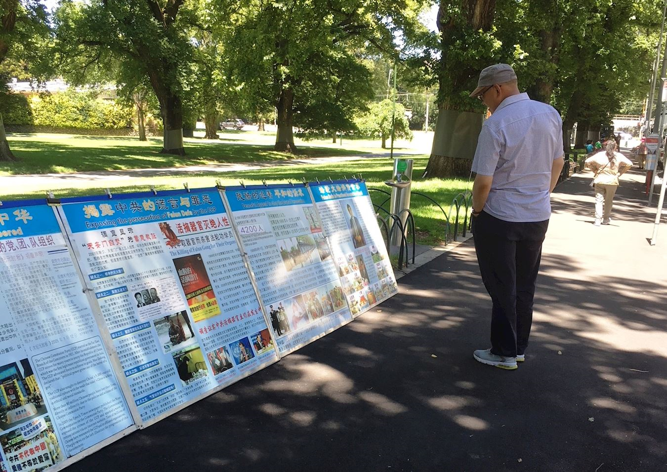 圣诞节前的一个下午,两名华人男子被大展板的内容吸引,认真地阅读。其中的中年人走到手里有真相资料的法轮功学员身旁,低声说:“辛苦了,辛苦了。出国前,几个朋友境外旅游后回到国内,和我聊起了国外有好多人在炼法轮功,还有好多资料可以看,还说了好多在国内根本就不知道的一些真相。这次和儿子出来旅游就是想真正的了解一下法轮功。”??他还表示,法轮功强身健体他是清楚的,但不明白天安门自焚和活摘法轮功学员器官的事情是怎么回事,法轮功学员对他说:“法轮功不仅是强身健体,是按照真善忍为修炼原则的高德大法,教人做好人,使人变得诚实、善良、宽容、平和。中共迫害法轮功,迫害修炼真善忍的好人,那么他们就是假恶暴了,那不就是坏人吗。”这位中年人表示赞同。