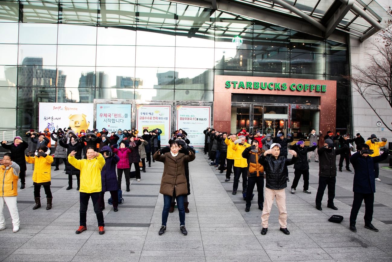 '图2:韩国法轮功学员在首尔市中心明洞中央邮局前炼法轮大法的第二套功法-法轮桩法。'