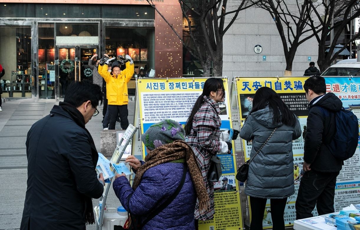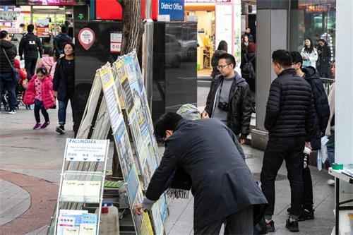 【明慧网二零一八年十二月二十六日】二零一八年十二月二十三日,韩国法轮功学员聚集在首尔市中心明洞中央邮局前举行集体炼功。法轮功学员安静祥和的炼功场面不仅使得韩国民众驻足观赏,也吸引了各国游客的目光。
