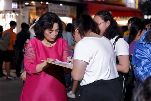 协调人吴锡昌表示:“四年前刚开始开设西门町景点时,有段时间常会下大雷雨,有一次因为下很大的雨本不想去,但后来还是坚持去摆了展板,那一整天豪雨不断,没有一个游客。可是等到晚上十点要收展板的时候,来了一个年轻女孩撑着伞在电视前面,默默看了半个小时,把所有真相影片都看过一遍,我问她哪里来的,她说是大陆来的,自由行。”就是这样的经历让法轮功学员们一直坚持到现在,他们表示,不想失去任何一个让众生听闻真相的机缘。