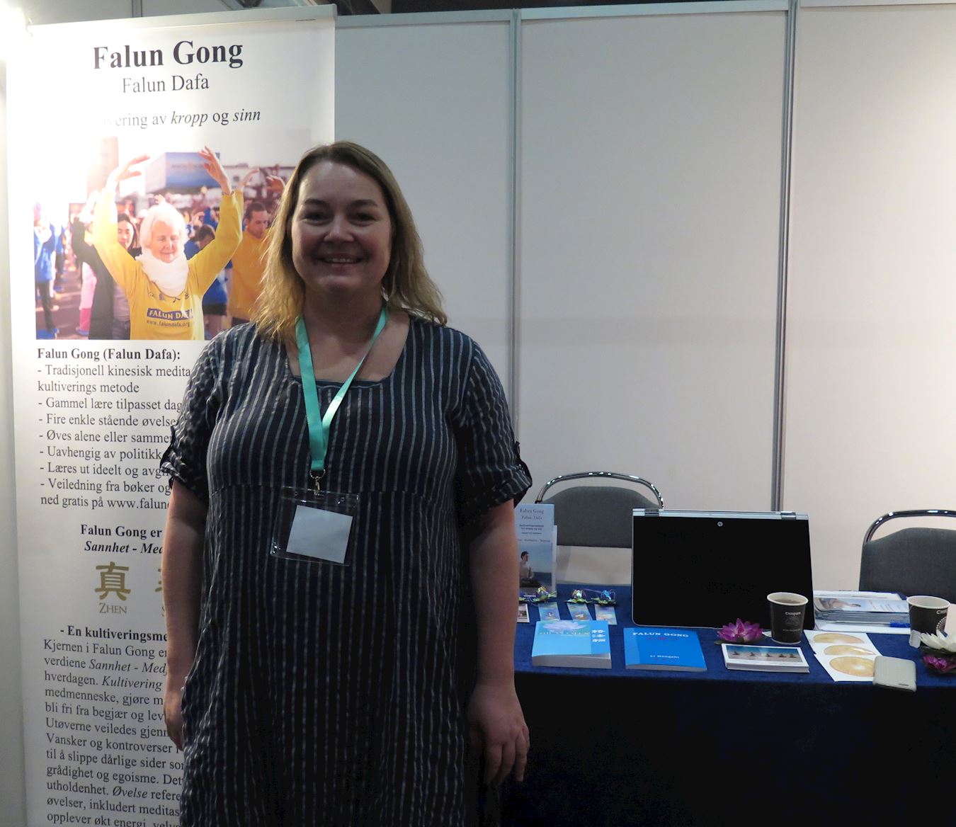 安娜(Anna)是博览会的年轻义工,她的妈妈来自中国,父亲是挪威人。安娜来到法轮功展位对法轮功产生了兴趣。她说:“我妈妈在家经常打坐,她也希望我能打坐让身心宁静。”这个在挪威出生长大的年轻人,在了解到法轮功在中国正在遭受中共的迫害,甚至法轮功学员的器官被盗用时感到非常震惊。她带上了法轮功资料,表示要更多的了解法轮功。