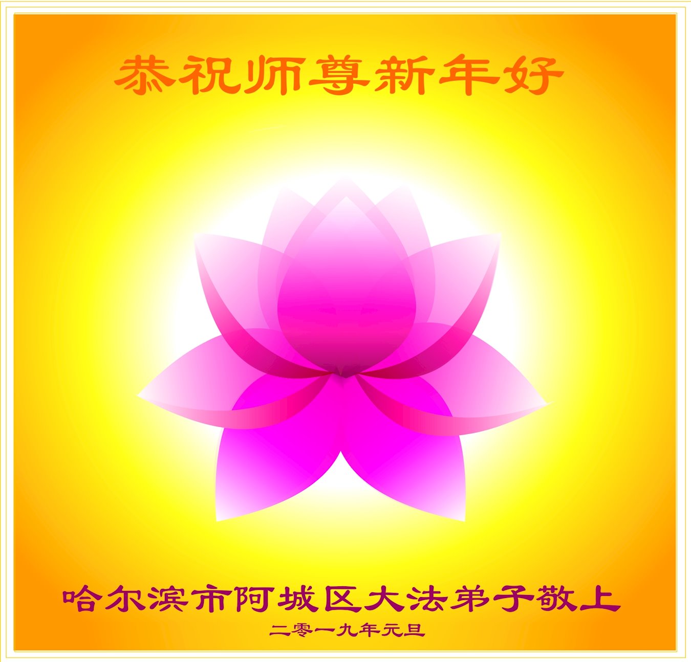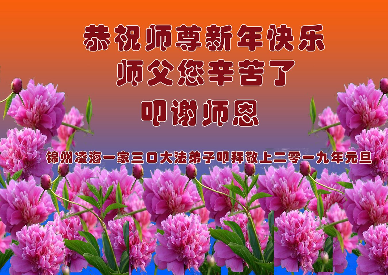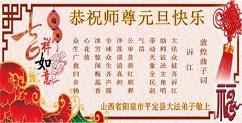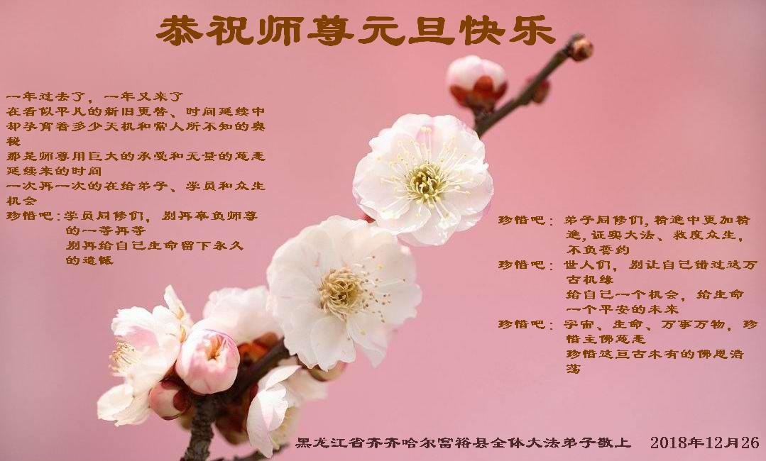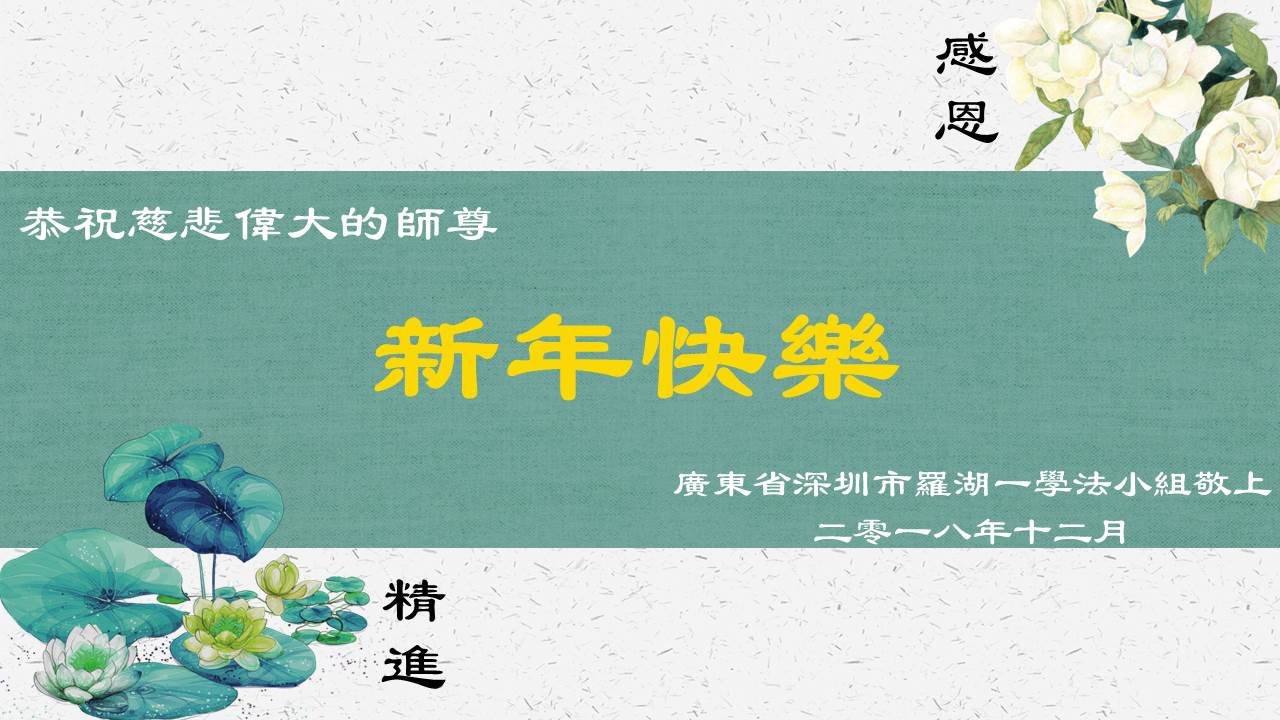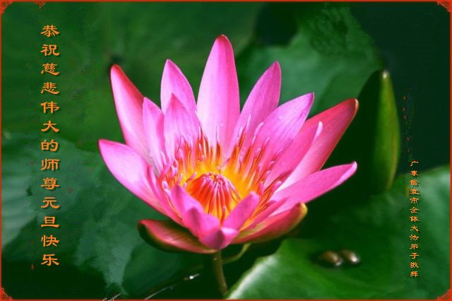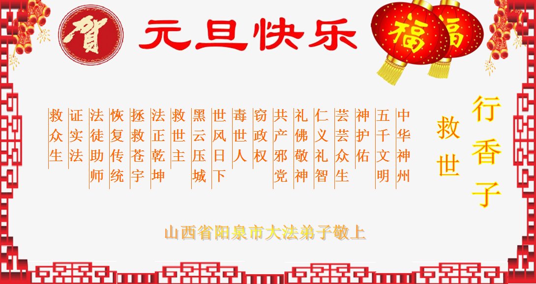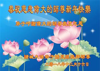 恭祝李大师元旦快乐!新年好!感恩李大师您的慈悲救度!把法轮大法的美好赐给我们!您的弟子告诉我们法轮大法真相,并让我们三退后诚念“法轮大法好!真善忍好!”我们就拥有了健康的身体以及给家人也带来了幸运,做生意和做事都兴旺顺利,告诉家人大法好他们也事事顺。