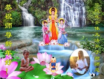 南半球夏日明媚的阳光下,朵朵莲花象征修炼人纯善的心灵,学员们双手合十,表达心声:“墨尔本大法弟子恭祝师尊新年快乐!”