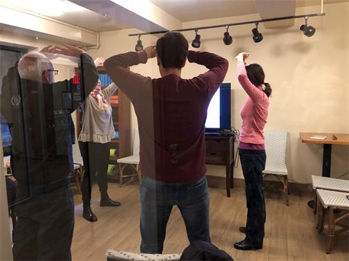 这一天是周末,又是节假日,顾客大都是美国各地和世界各地的游客。其中一位来自华盛顿特区的先生是做物业管理的,看到天梯招牌上独特的概念就走進来问真相。参加了法轮大法介绍班之后,他请我们为他在店里拍照,说要拿回去放在公司的网站上做介绍,这样他们公司分布在波士顿、华府、纽约等几个州的数千位同事就都能看到天梯书店的信息了。碰巧在书店加班的那位西人同修认真的为客人播放了法轮大法录像片段、回答了提问,并教授了五套功法。介绍班结束后,客人觉得收获很大,不愿离开,就又坐到咖啡屋吃了午餐。