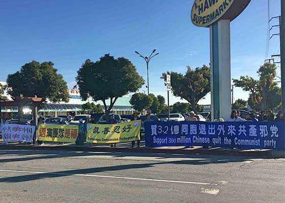 - 洛杉矶法轮功学员声援3.2亿中国人三退(图)- 十二月一日,洛杉矶的部份法轮功学员声援三亿两千多万中国人退出中共恶党、团、队组织;同时告诉人们法轮大法好,并要求立即停止迫害法轮功。