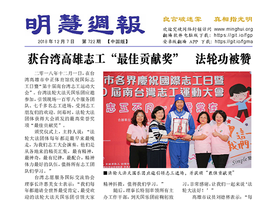 - 明慧周报:大陆版(第七二二期)- 获台湾高雄志工“最佳贡献奖” 法轮功被赞