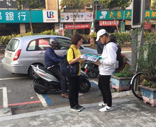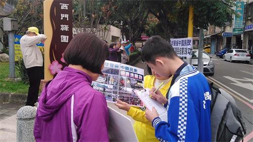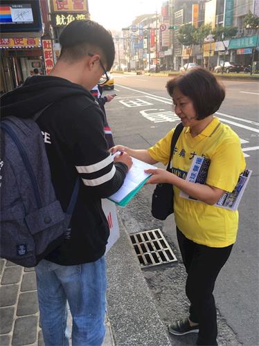 一位曾在大陆工作多年的先生表示,耳闻中共迫害法轮功多年,今天从台湾法轮功学员的口中,得到第一手的真相,感到喜悦。除了签名支持控江活动,也向学员表示:“谢谢你!辛苦了!”