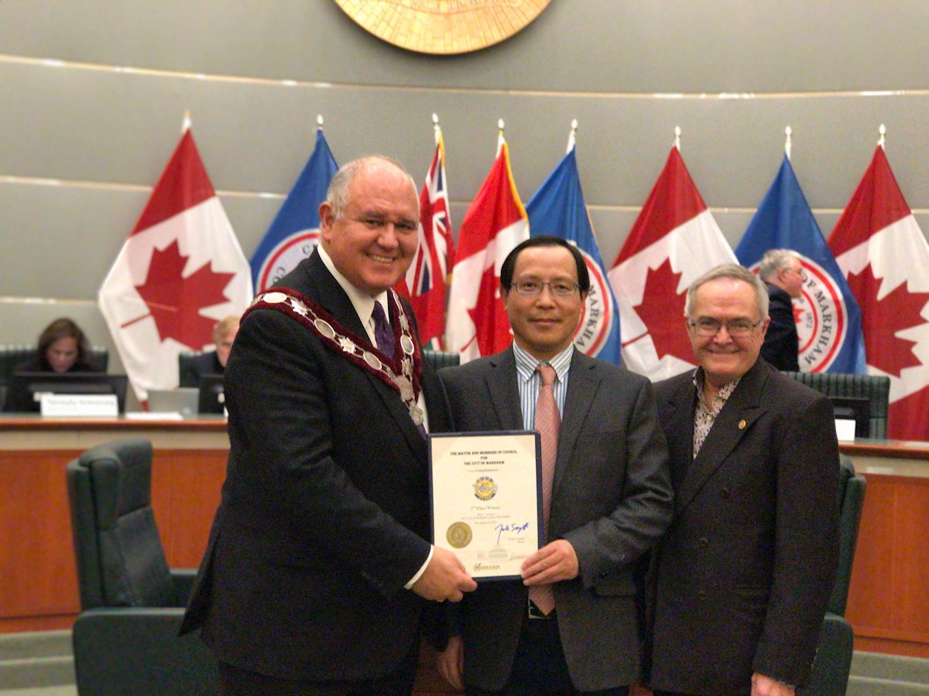 图1:二零一八年二月十三日晚七点,加拿大万锦市市长Frank Scarpitti(左)在市议政厅向参加二零一七年圣诞游行的获奖团体颁发奖状,多伦多天国乐团获乐团类别二等奖,多伦多天国乐团团长江帆(中)领奖。
