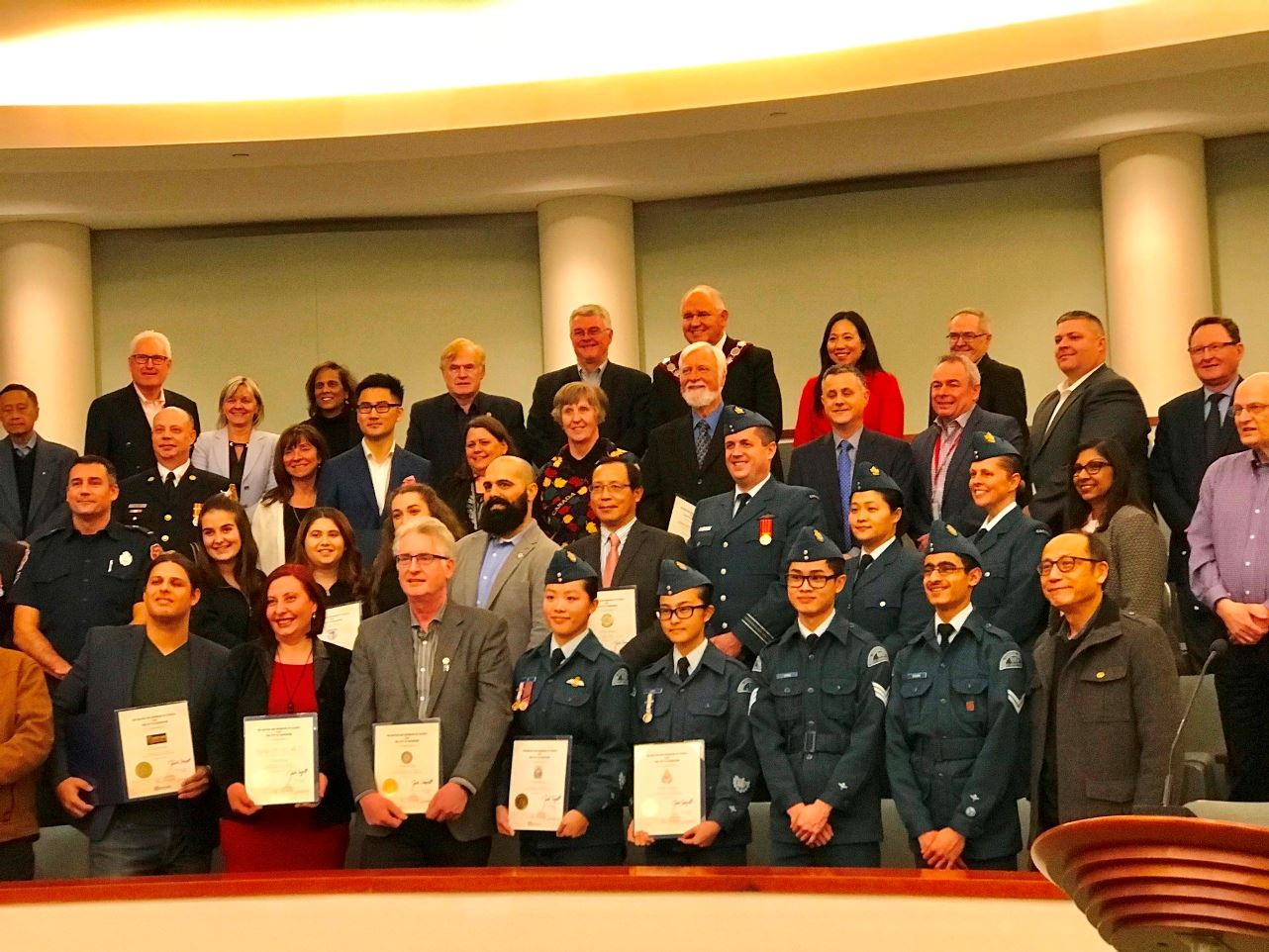 图2:万锦市议会市长和全体议员与所有获奖团体合影。第二排左六是天国乐团团长江帆。