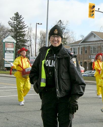 图12:二零一五年十一月二十八日的游行中,万锦市警察局Denise Cartier警官赞天国乐团的演奏很精彩。