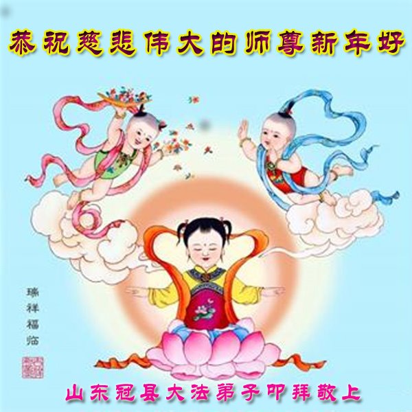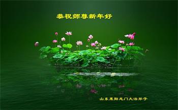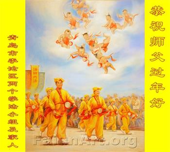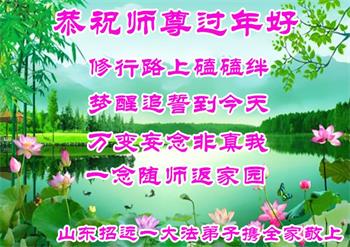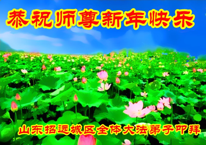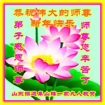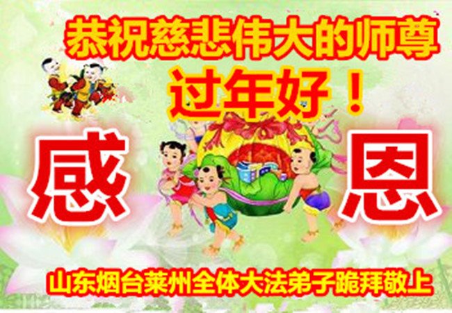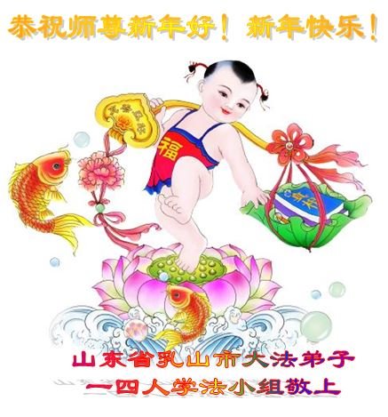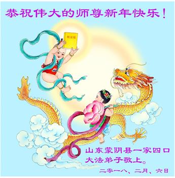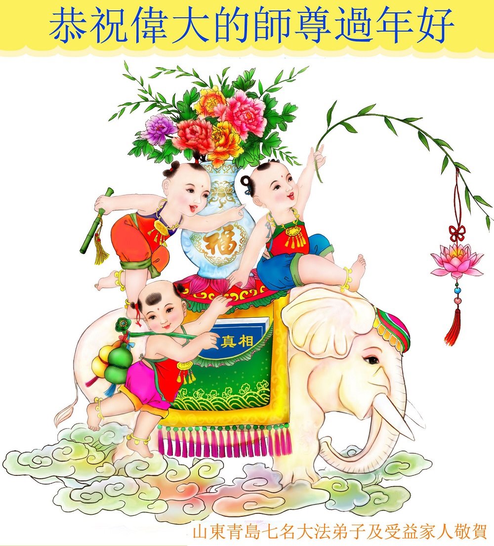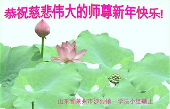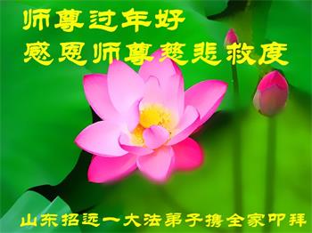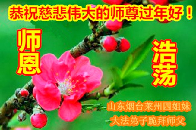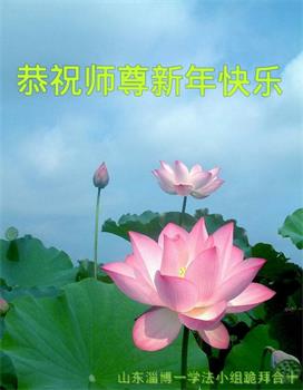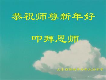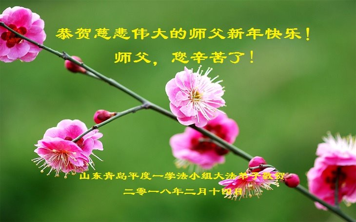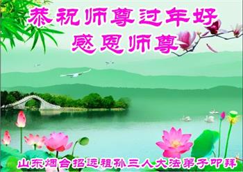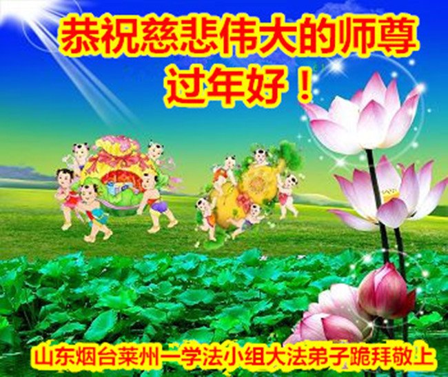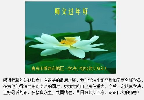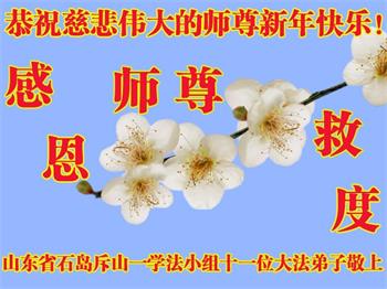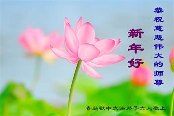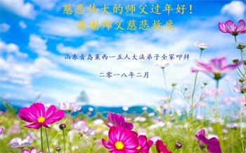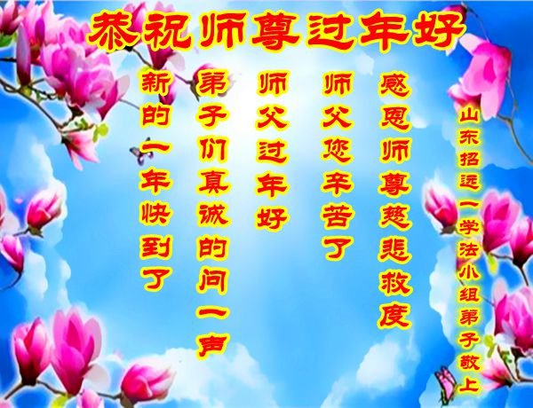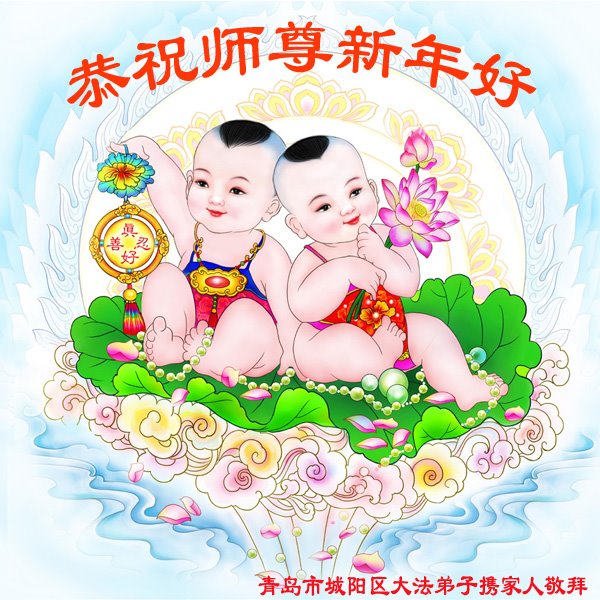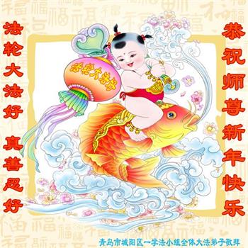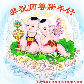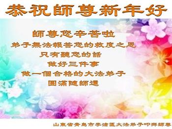 慈悲伟大的师父好!在这天地更新、万物复苏的时候,我们青岛东部的一资料点的全体老少大法弟子及家人给您拜年!恭祝师父新年快乐!借此,我们把满怀对慈悲伟大的师父的思念和感恩之心凝成一句话:学好法,修好心,不懈怠,多救人,路走正,报师恩,证实法!
