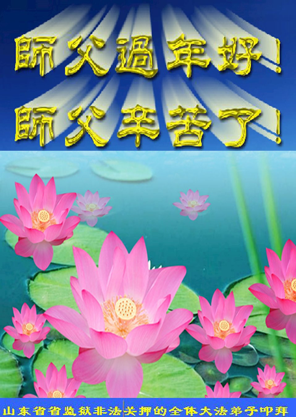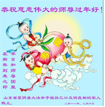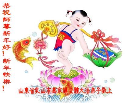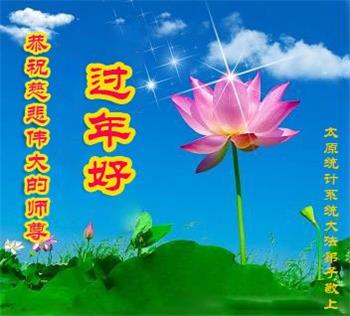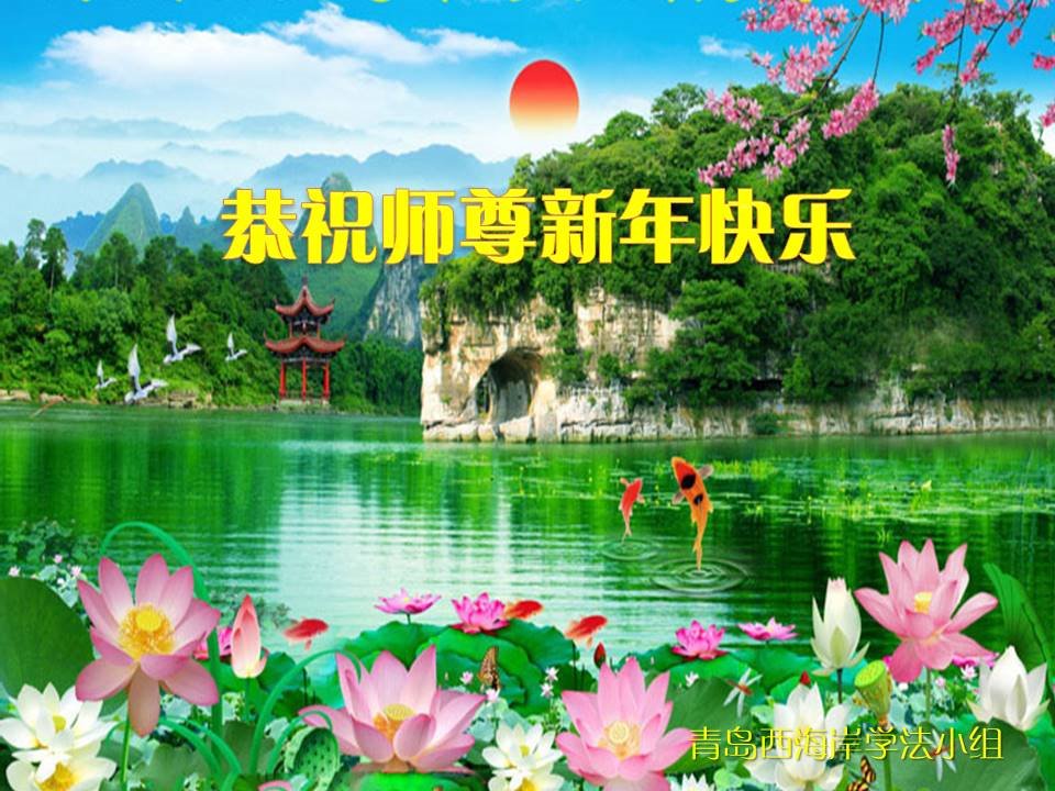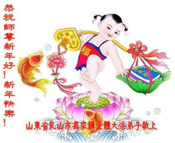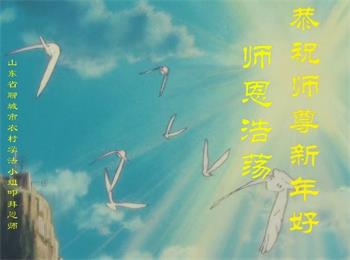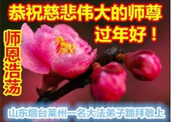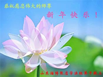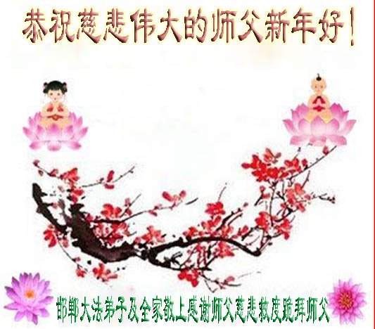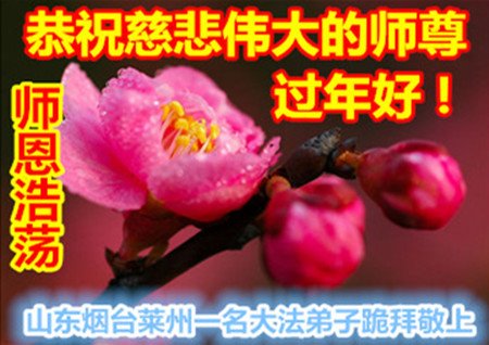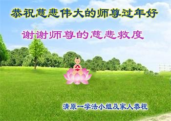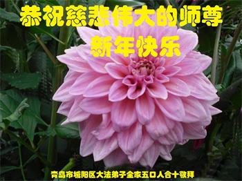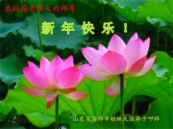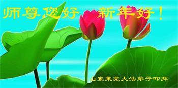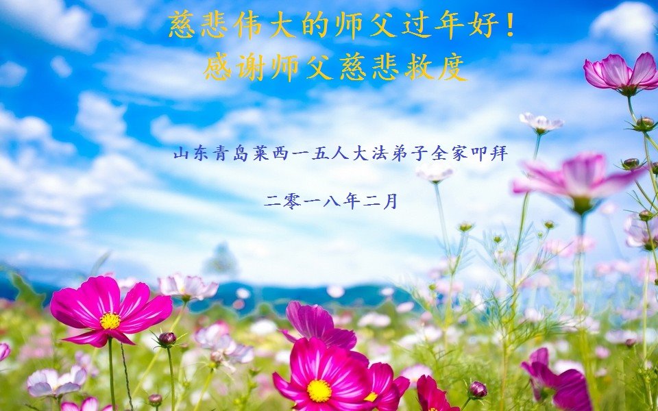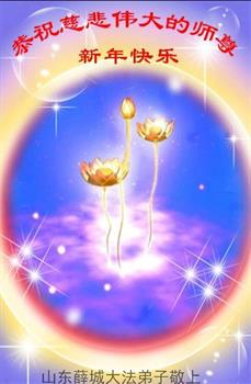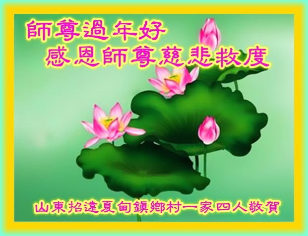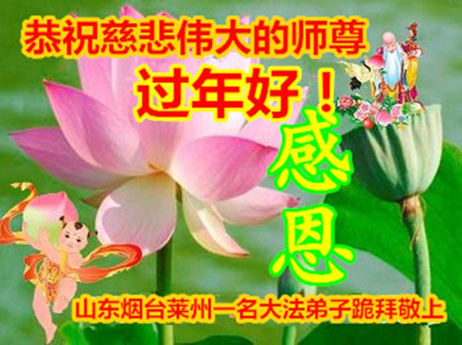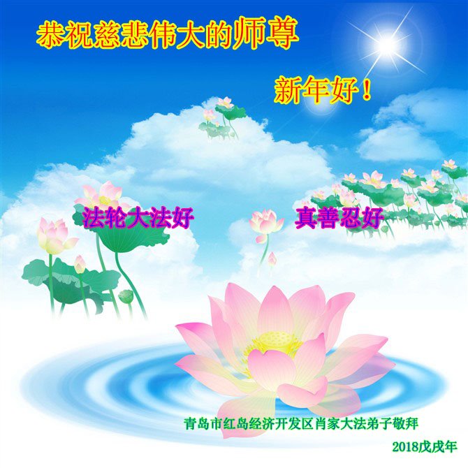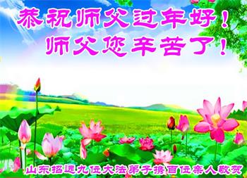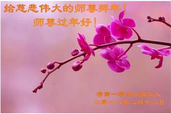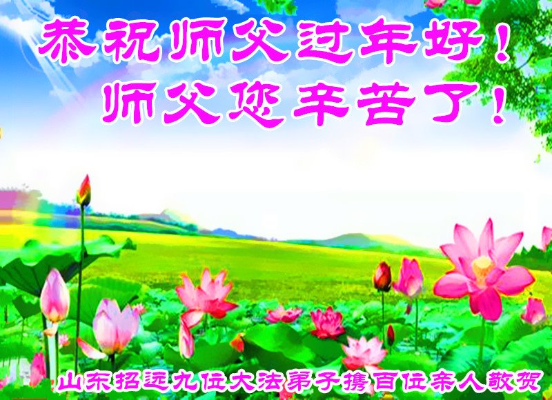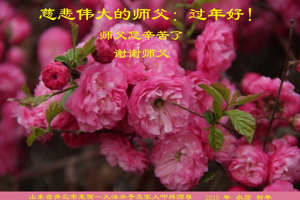 慈悲伟大的师父好!在这天地更新、万物复苏的时候,我们青岛东部的一资料点的全体老少大法弟子及家人给您拜年!恭祝师父新年快乐!借此,我们把满怀对慈悲伟大的师父的思念和感恩之心凝成一句话:学好法,修好心,不懈怠,多救人,路走正,报师恩,证实法!