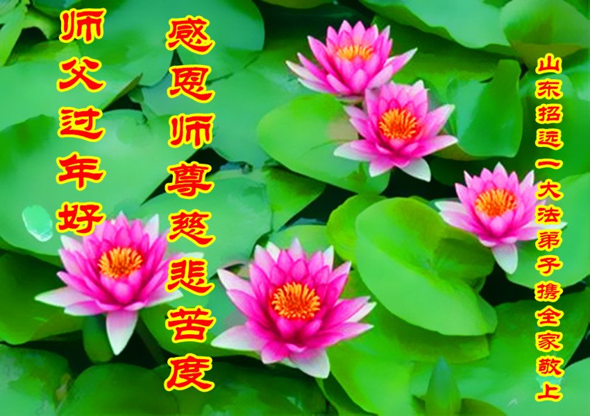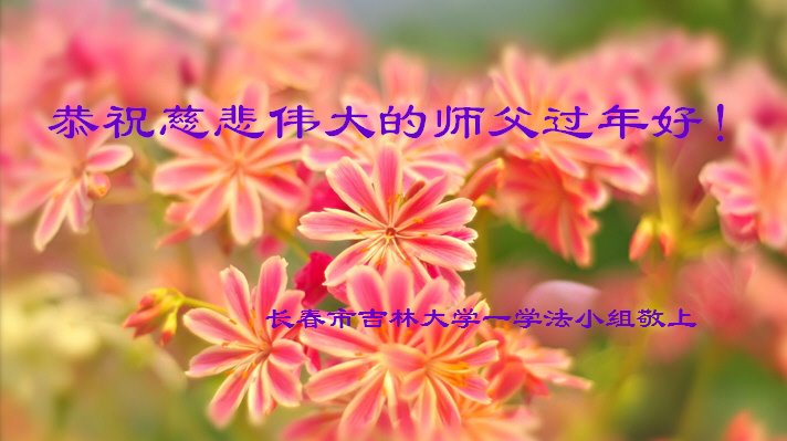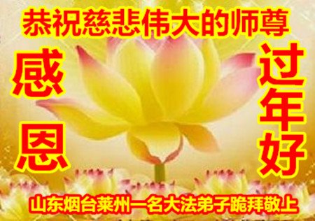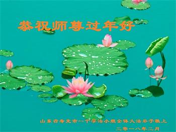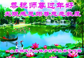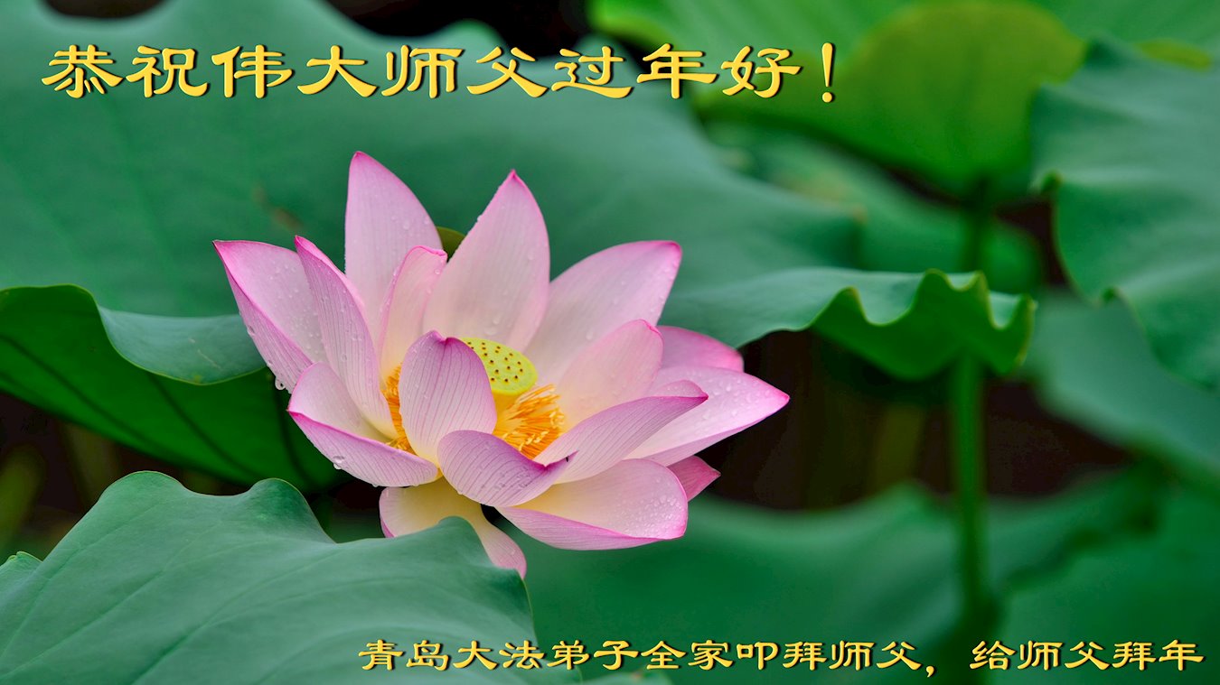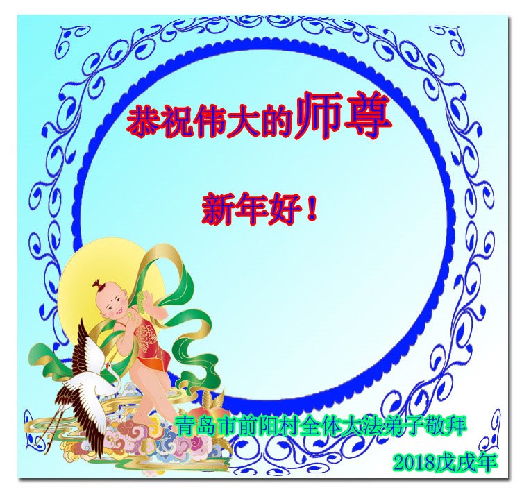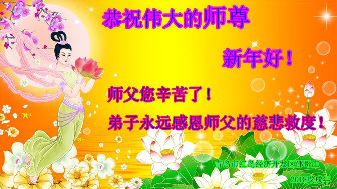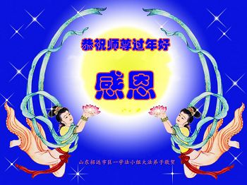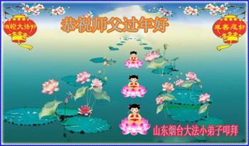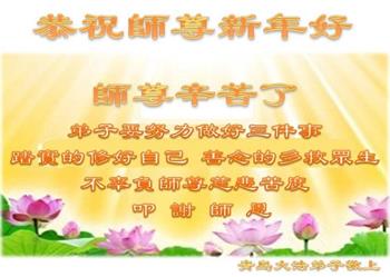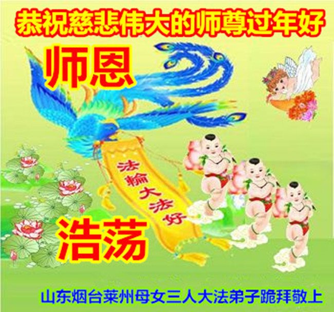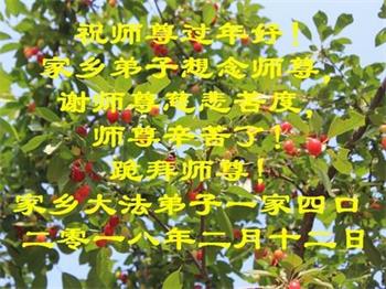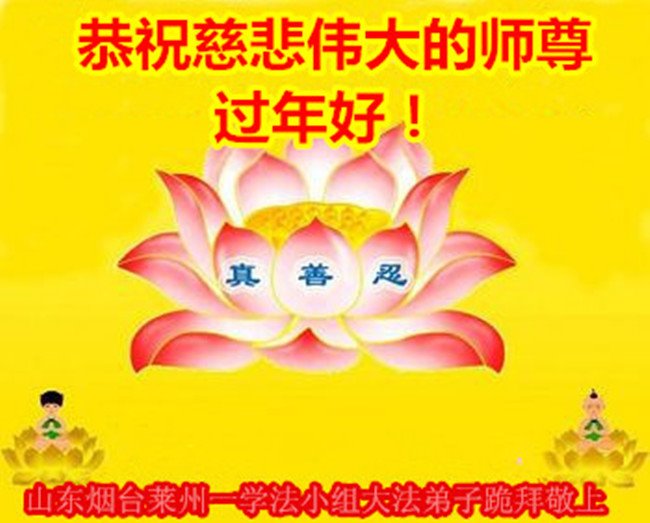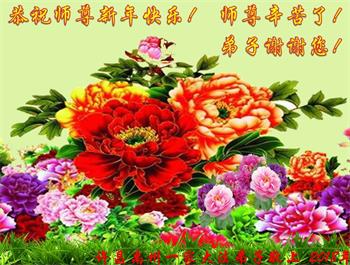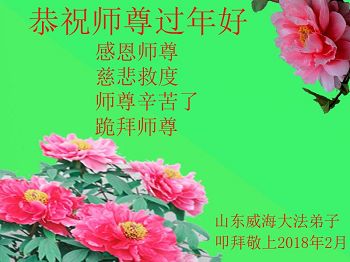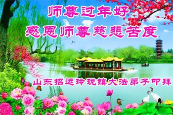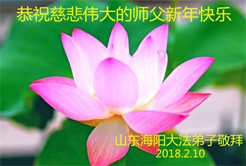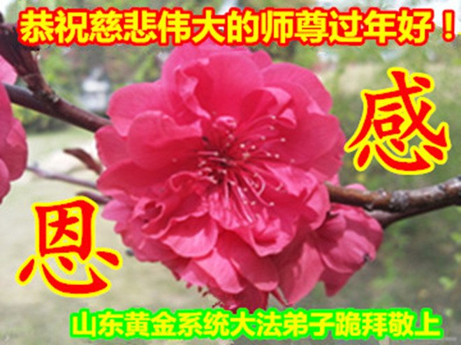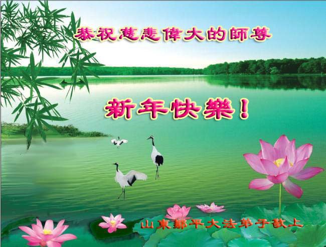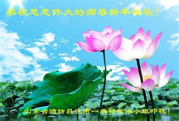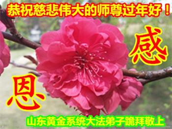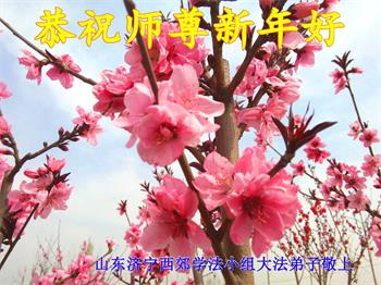 慈悲伟大的师父好!在这天地更新、万物复苏的时候,我们青岛东部的一资料点的全体老少大法弟子及家人给您拜年!恭祝师父新年快乐!借此,我们把满怀对慈悲伟大的师父的思念和感恩之心凝成一句话:学好法,修好心,不懈怠,多救人,路走正,报师恩,证实法!