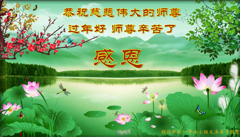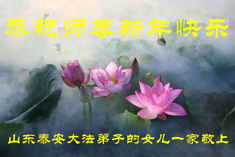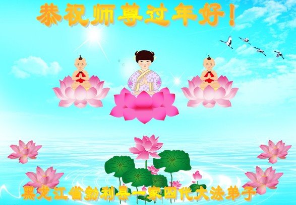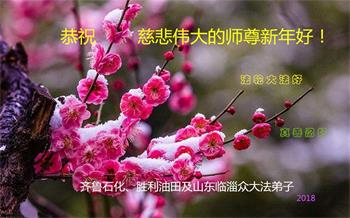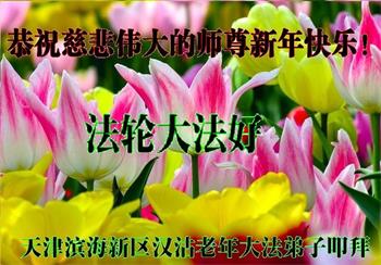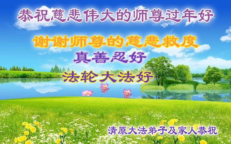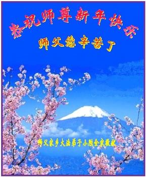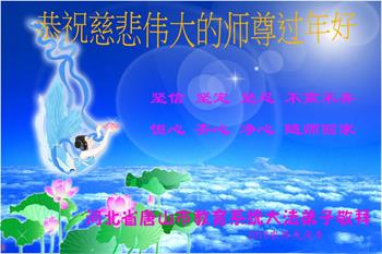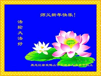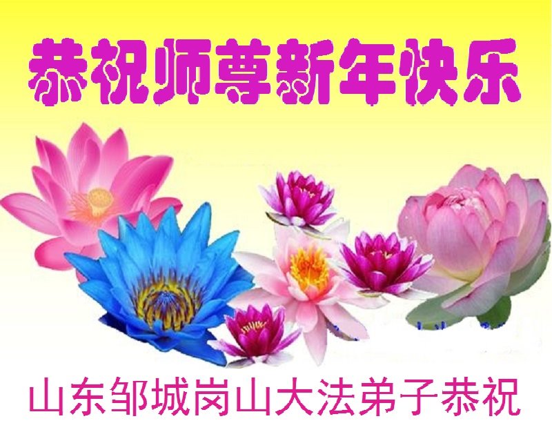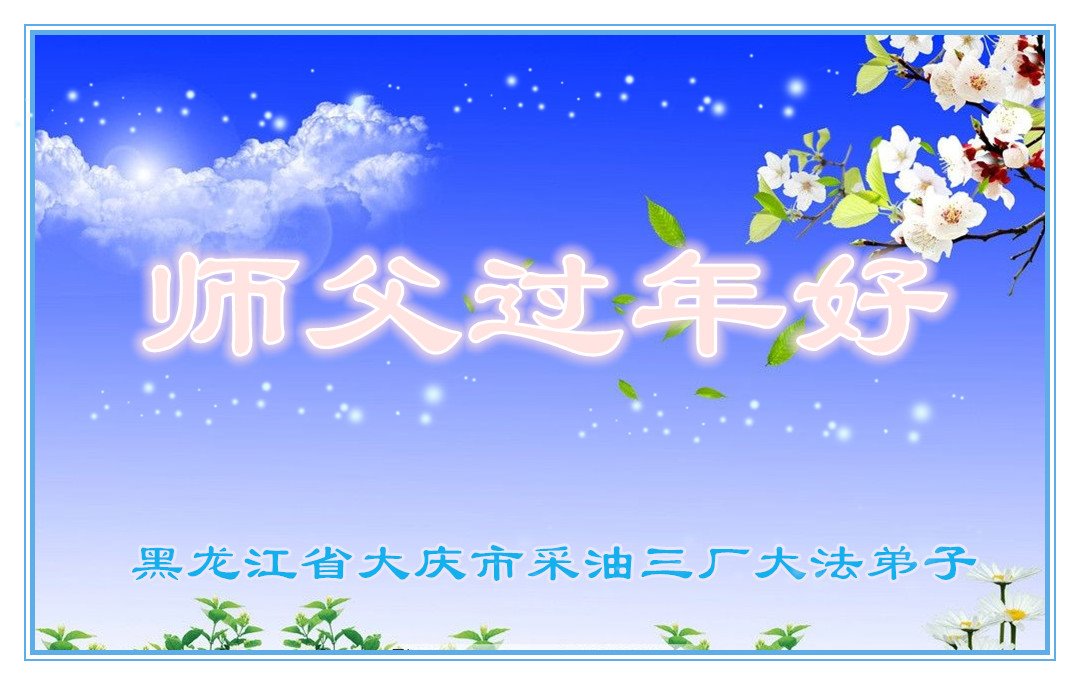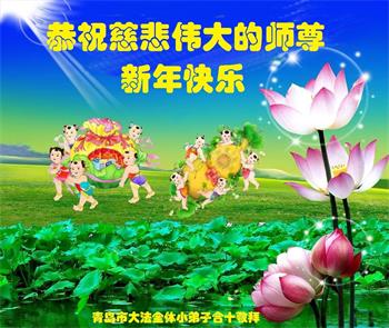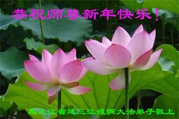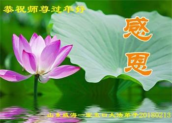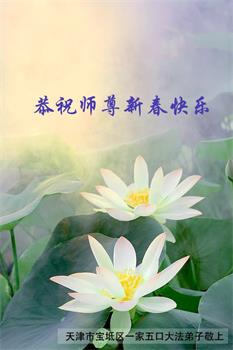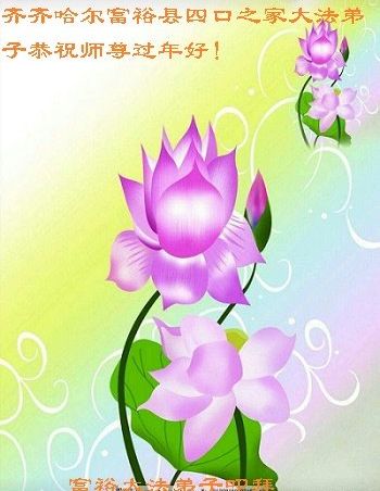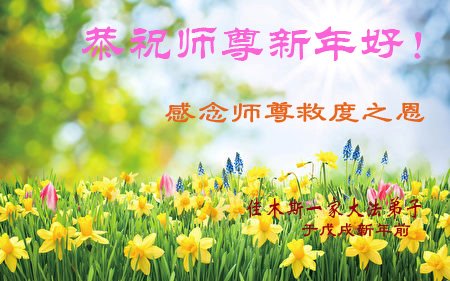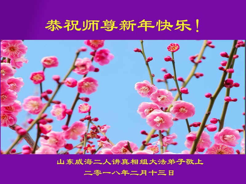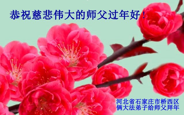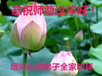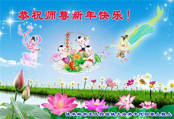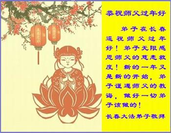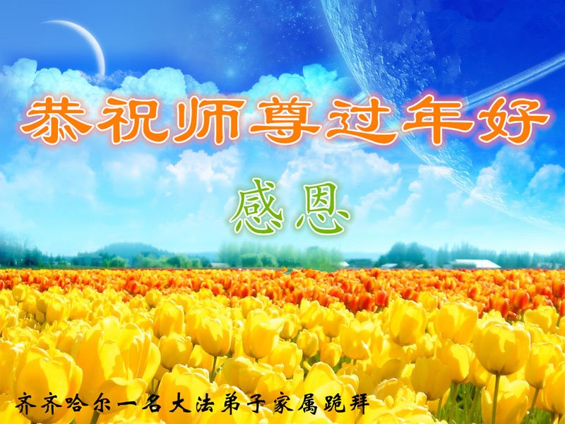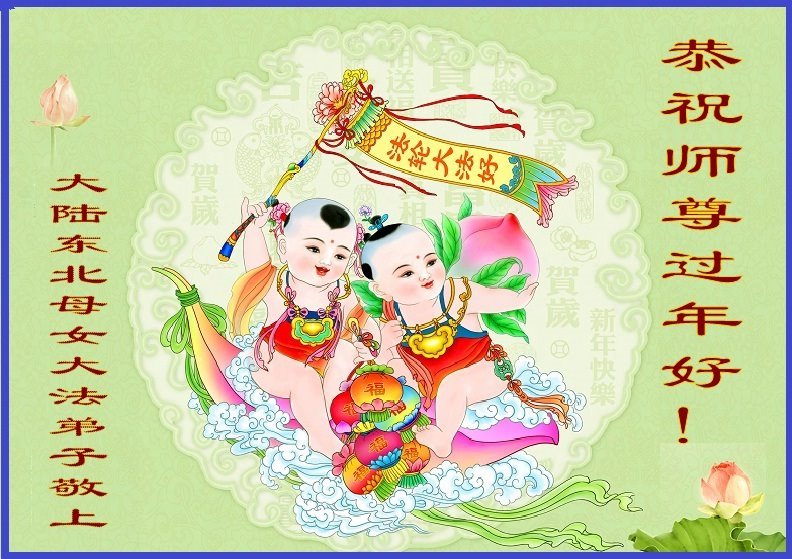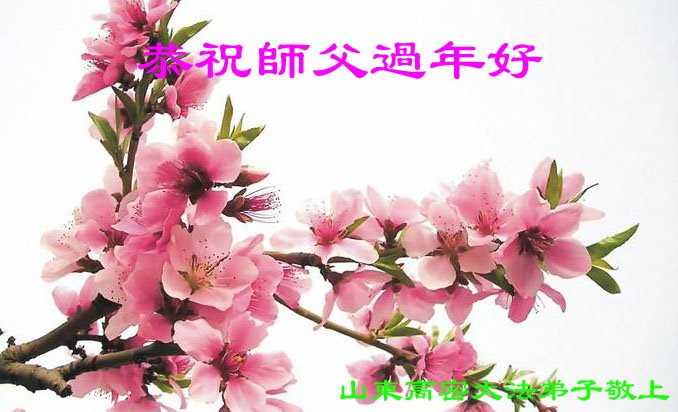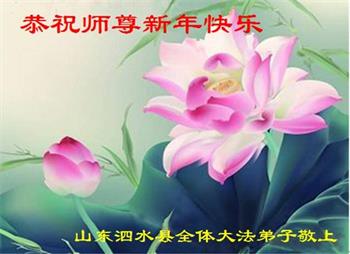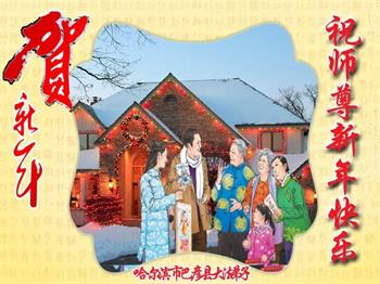 慈悲伟大的师父好!在这天地更新、万物复苏的时候,我们青岛东部的一资料点的全体老少大法弟子及家人给您拜年!恭祝师父新年快乐!借此,我们把满怀对慈悲伟大的师父的思念和感恩之心凝成一句话:学好法,修好心,不懈怠,多救人,路走正,报师恩,证实法!