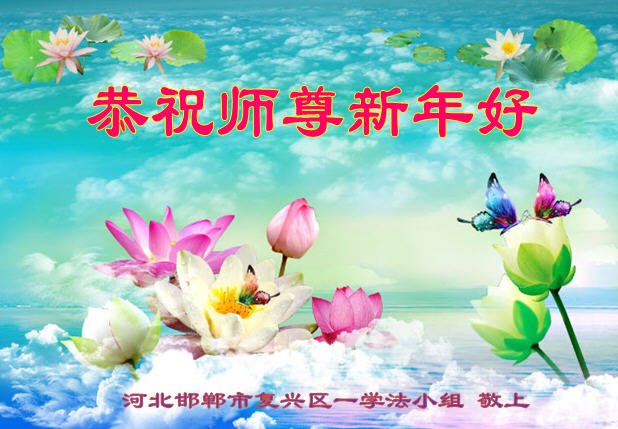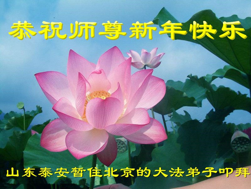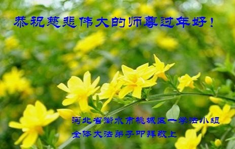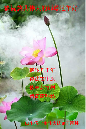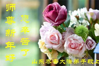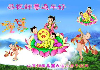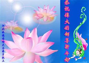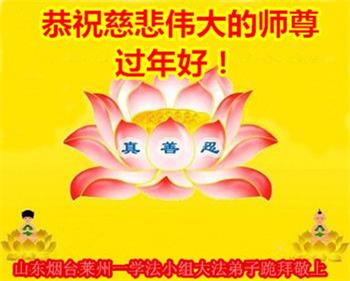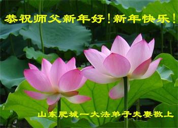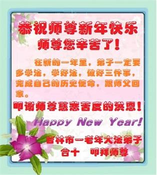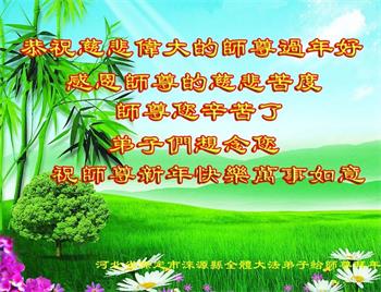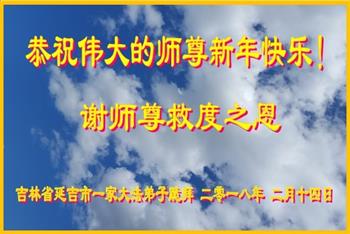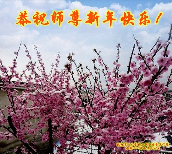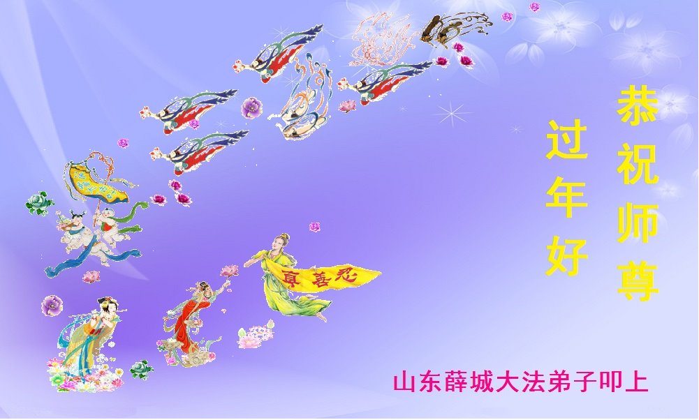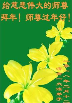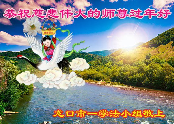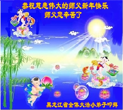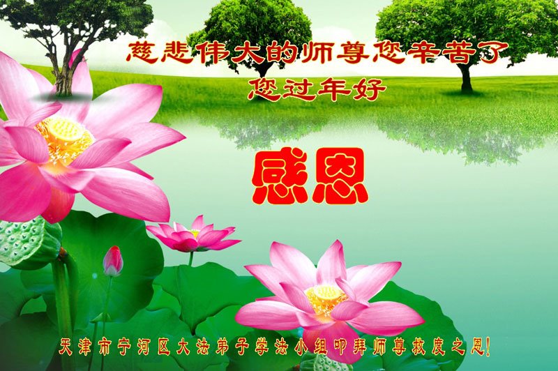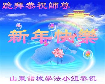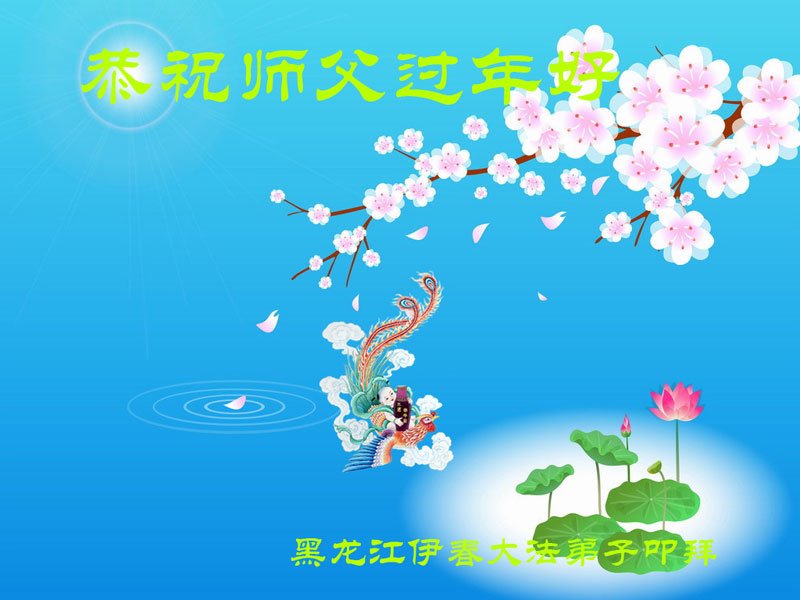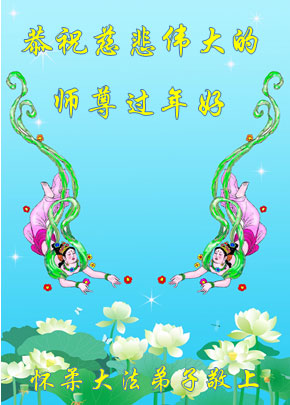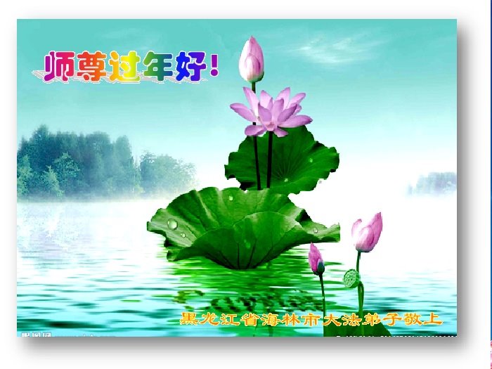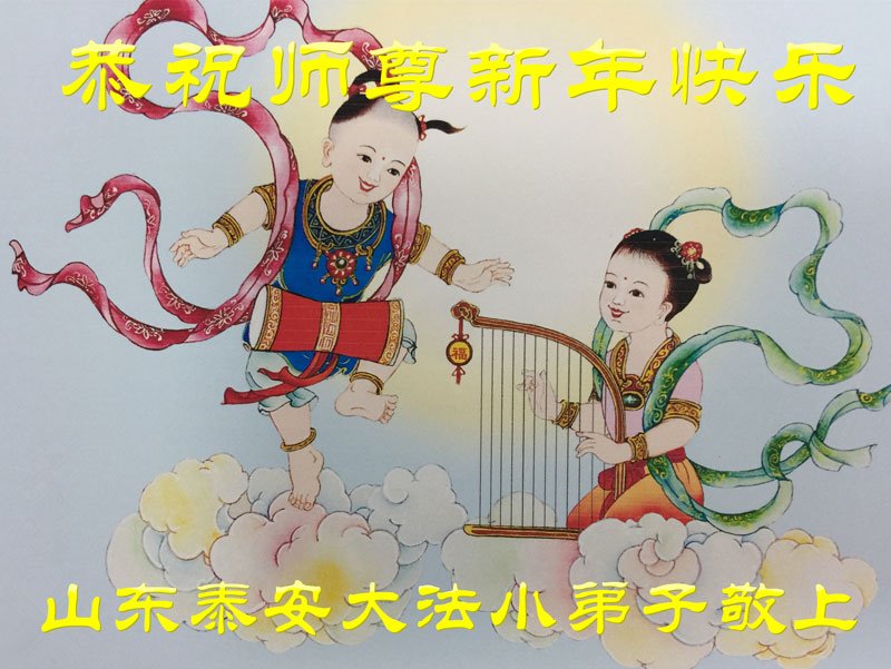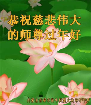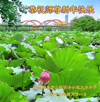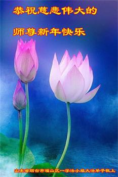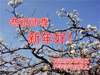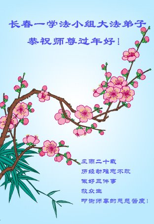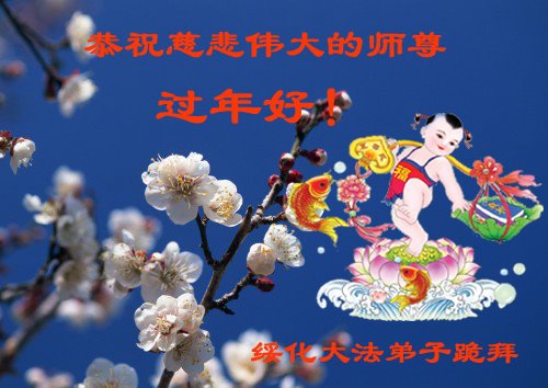 慈悲伟大的师父好!在这天地更新、万物复苏的时候,我们青岛东部的一资料点的全体老少大法弟子及家人给您拜年!恭祝师父新年快乐!借此,我们把满怀对慈悲伟大的师父的思念和感恩之心凝成一句话:学好法,修好心,不懈怠,多救人,路走正,报师恩,证实法!