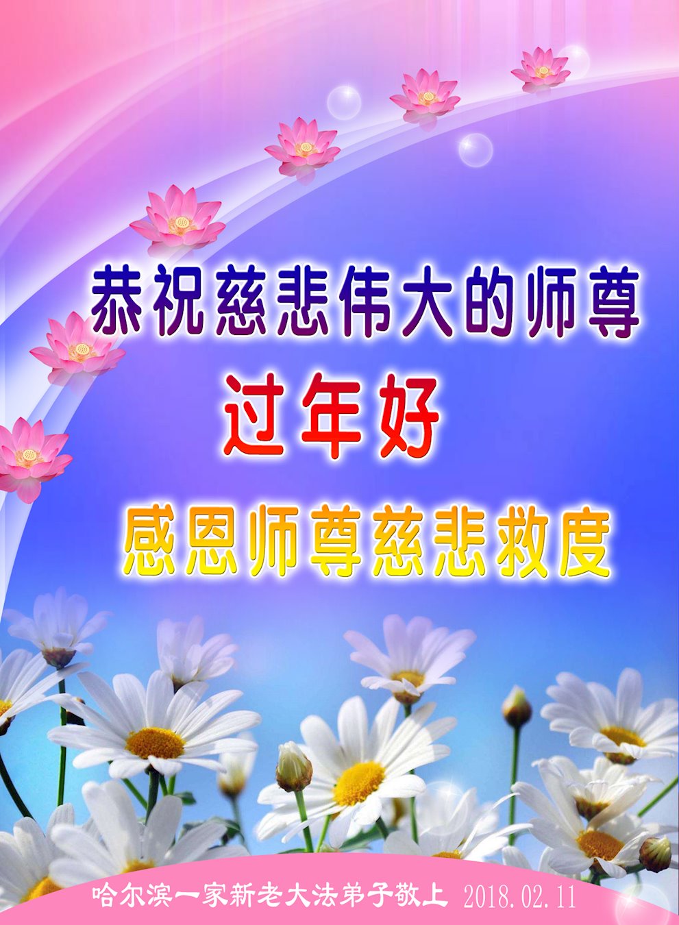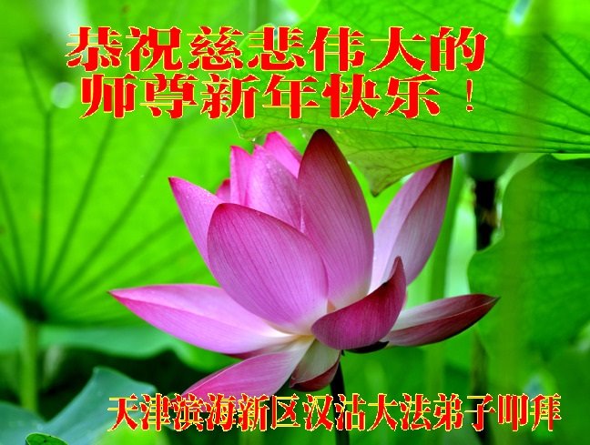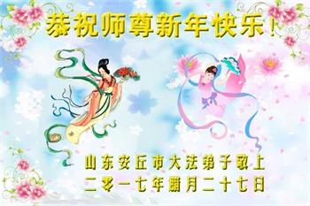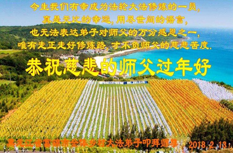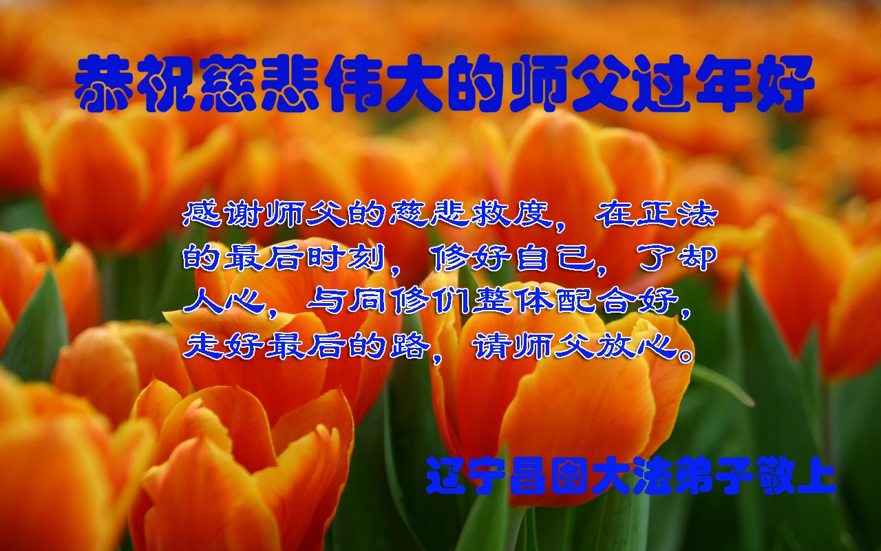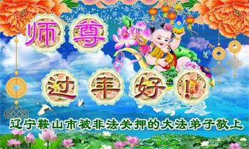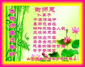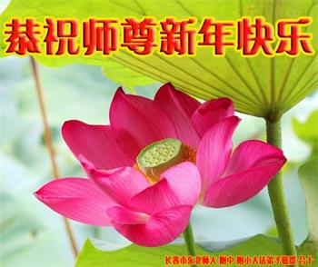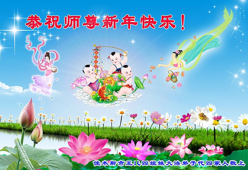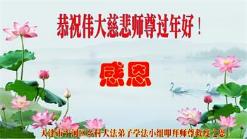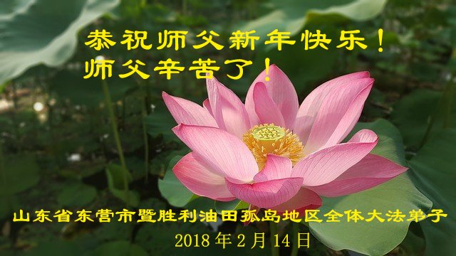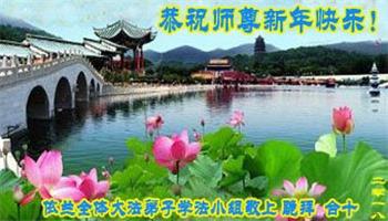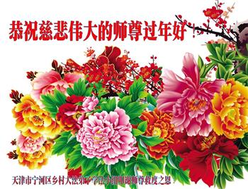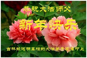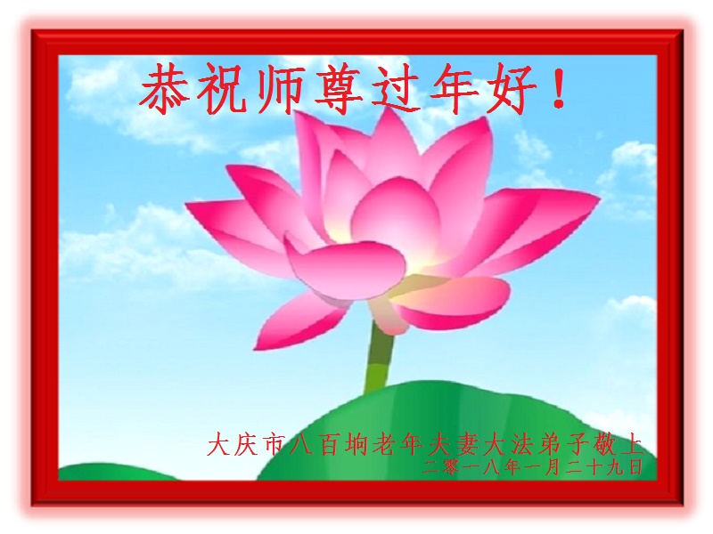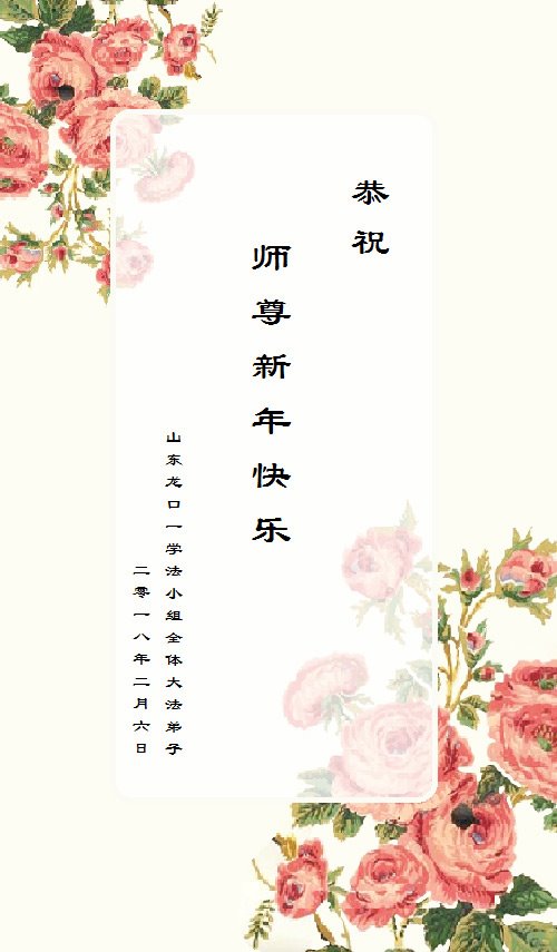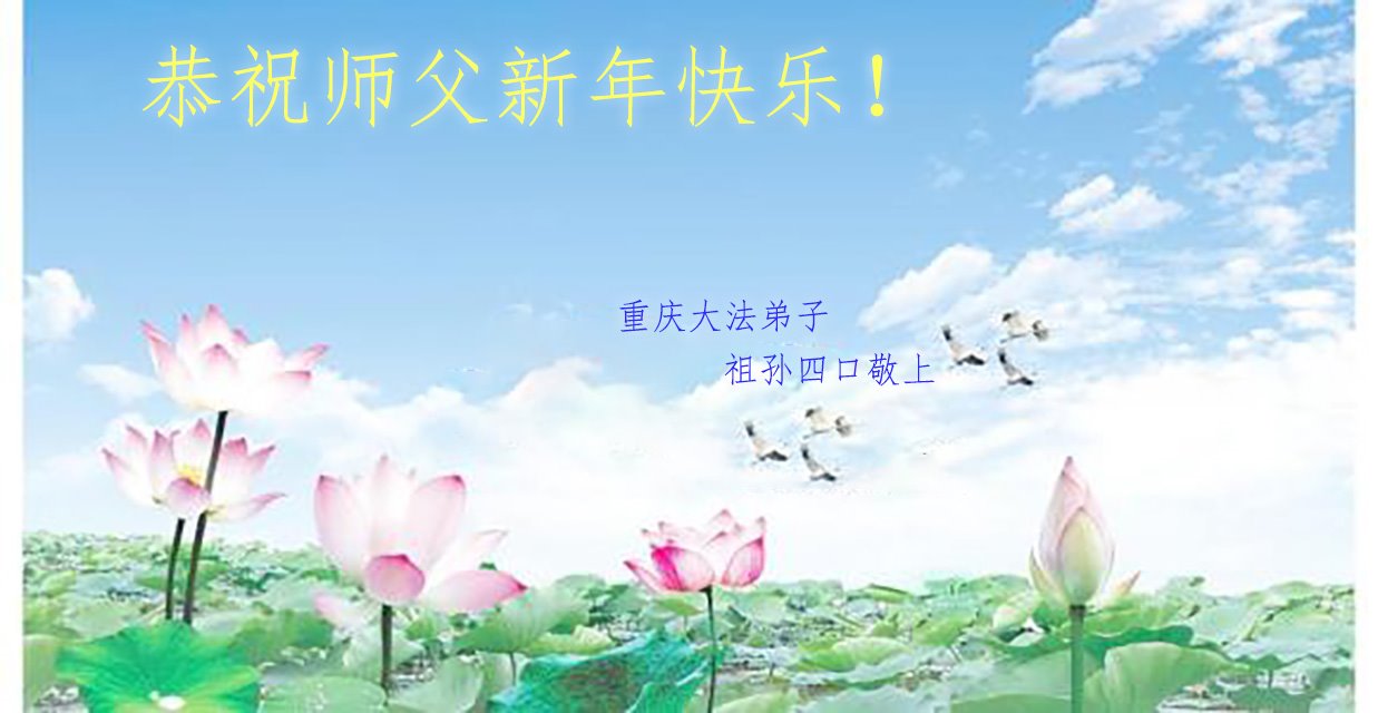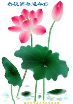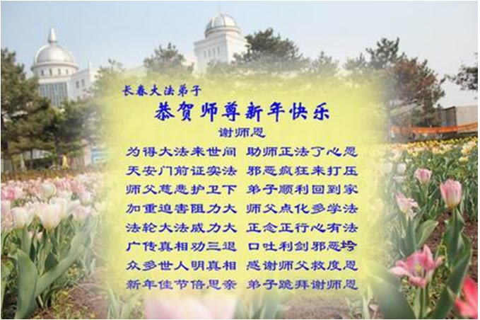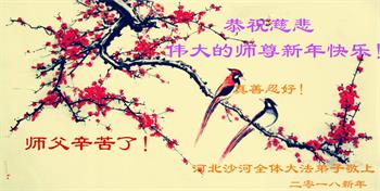 慈悲伟大的师父好!在这天地更新、万物复苏的时候,我们青岛东部的一资料点的全体老少大法弟子及家人给您拜年!恭祝师父新年快乐!借此,我们把满怀对慈悲伟大的师父的思念和感恩之心凝成一句话:学好法,修好心,不懈怠,多救人,路走正,报师恩,证实法!