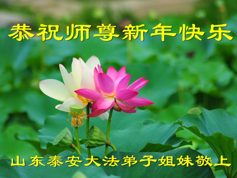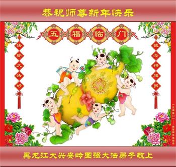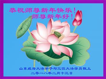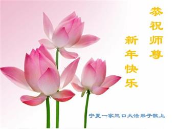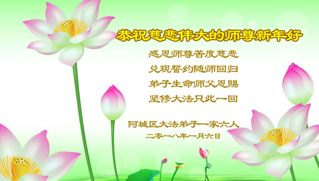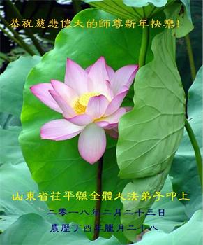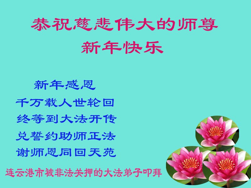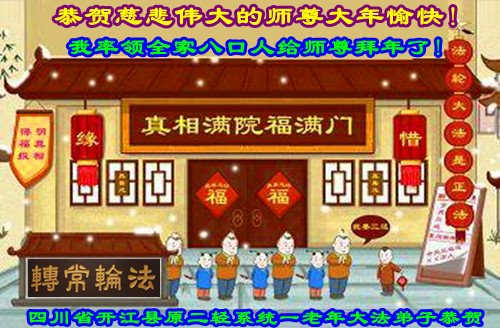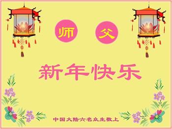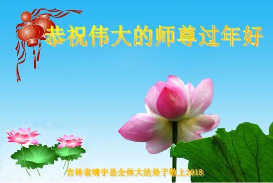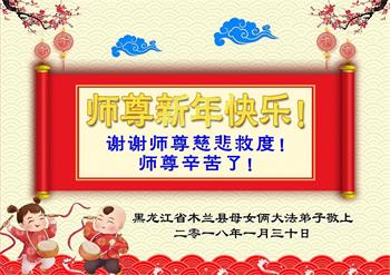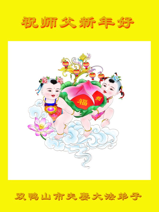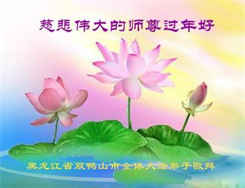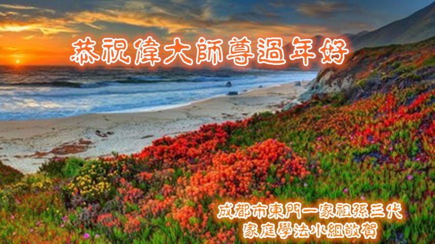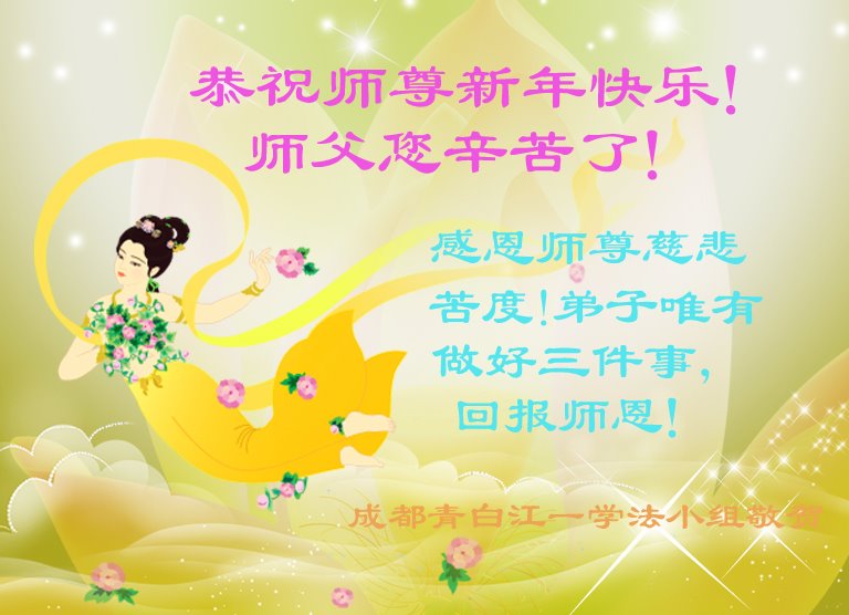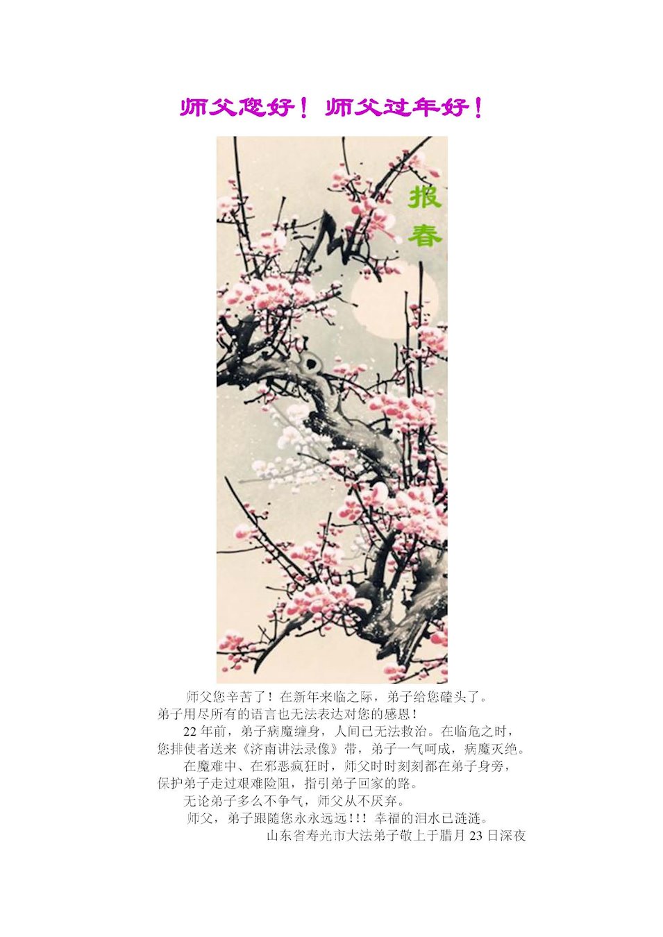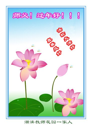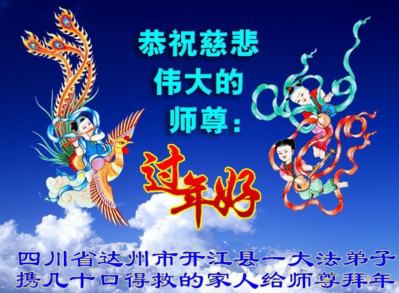 慈悲伟大的师父好!在这天地更新、万物复苏的时候,我们青岛东部的一资料点的全体老少大法弟子及家人给您拜年!恭祝师父新年快乐!借此,我们把满怀对慈悲伟大的师父的思念和感恩之心凝成一句话:学好法,修好心,不懈怠,多救人,路走正,报师恩,证实法!