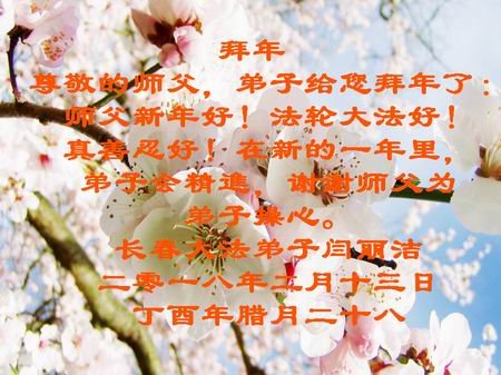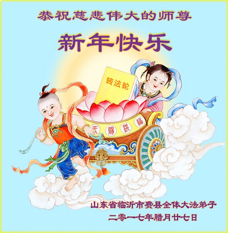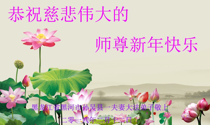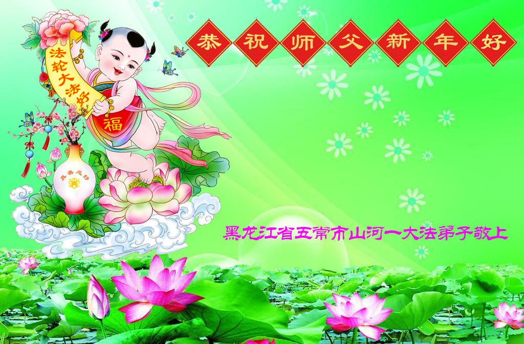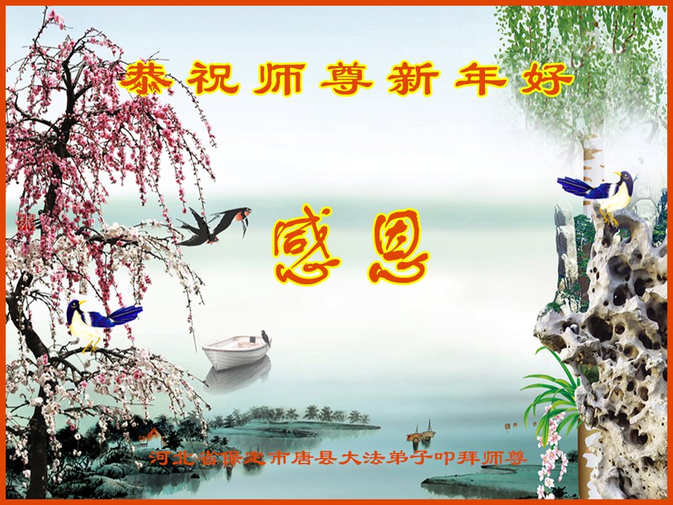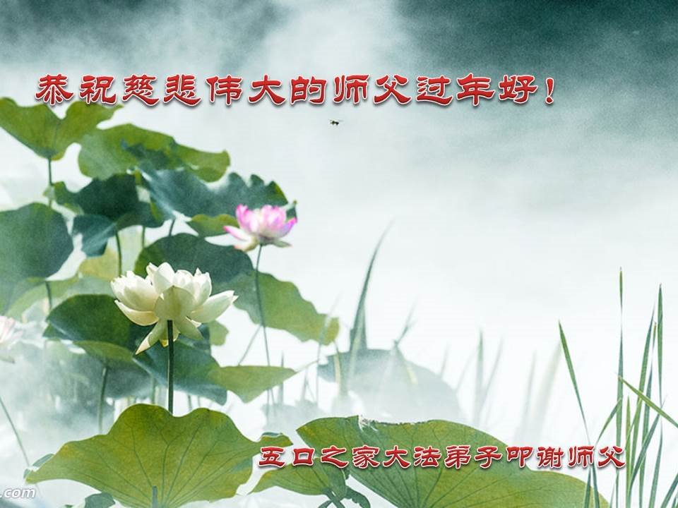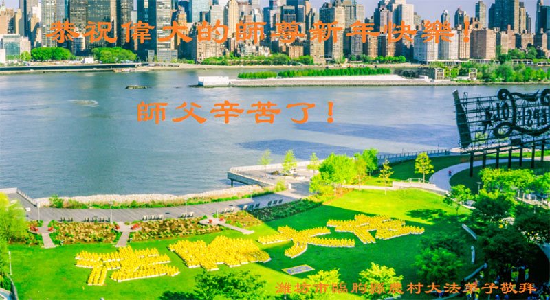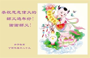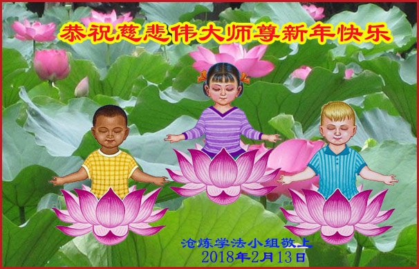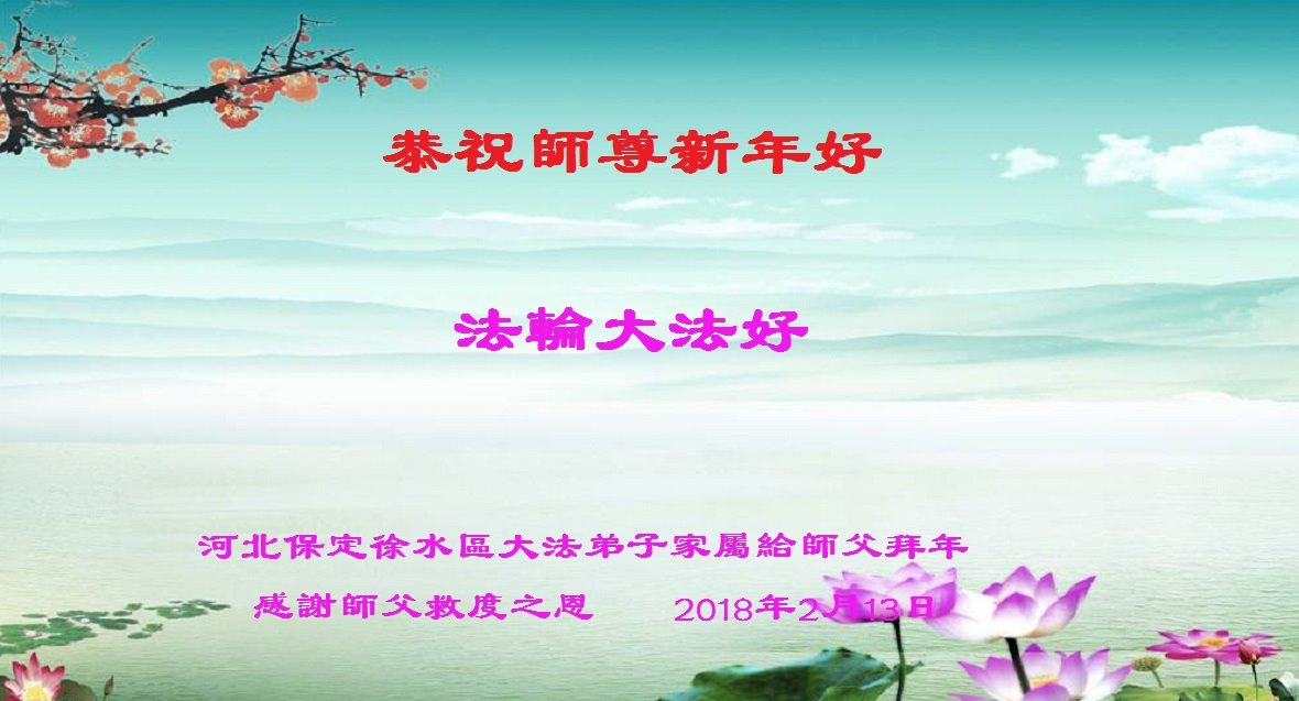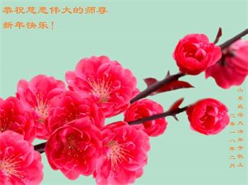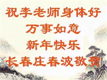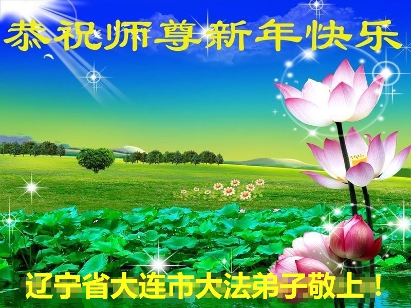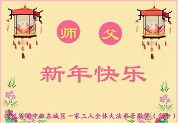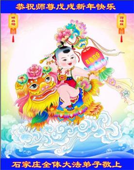 慈悲伟大的师父好!在这天地更新、万物复苏的时候,我们青岛东部的一资料点的全体老少大法弟子及家人给您拜年!恭祝师父新年快乐!借此,我们把满怀对慈悲伟大的师父的思念和感恩之心凝成一句话:学好法,修好心,不懈怠,多救人,路走正,报师恩,证实法!