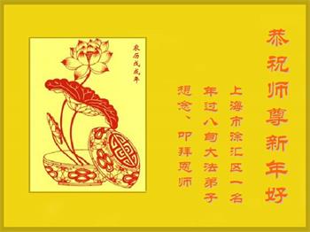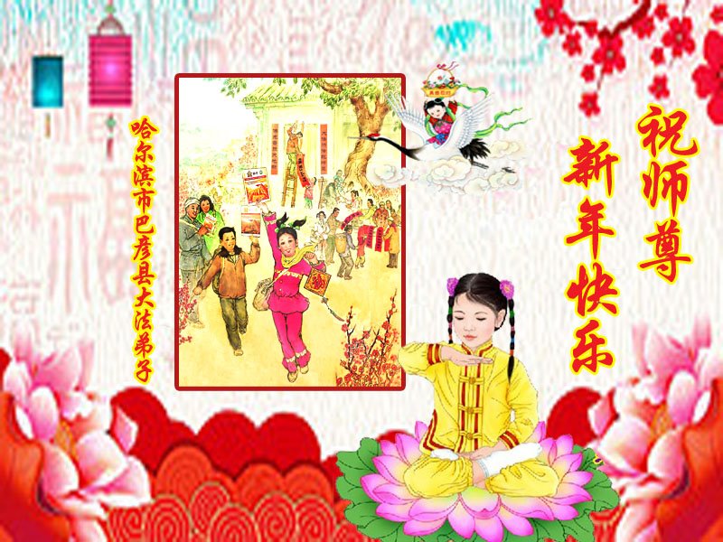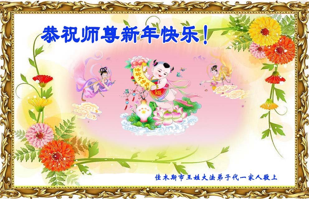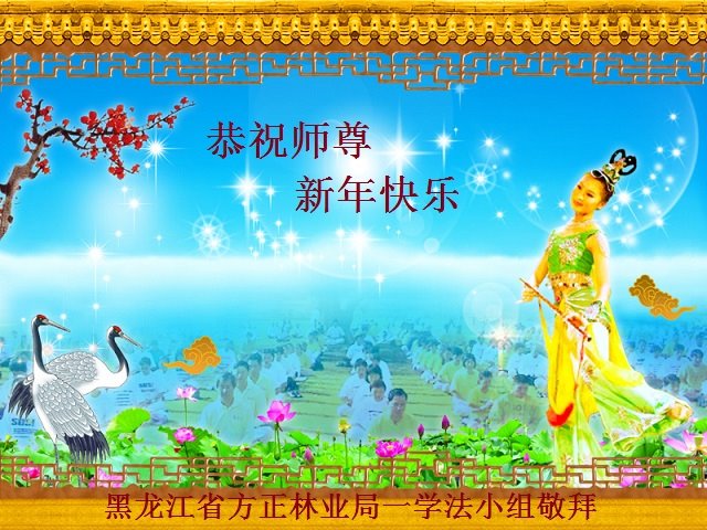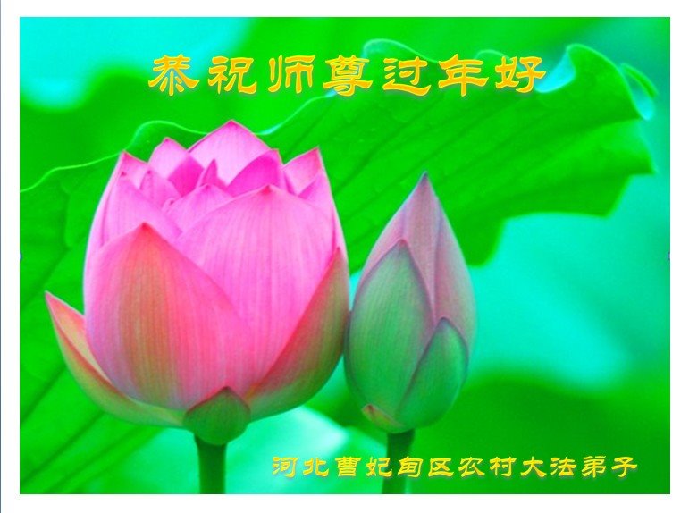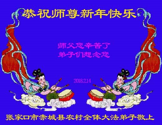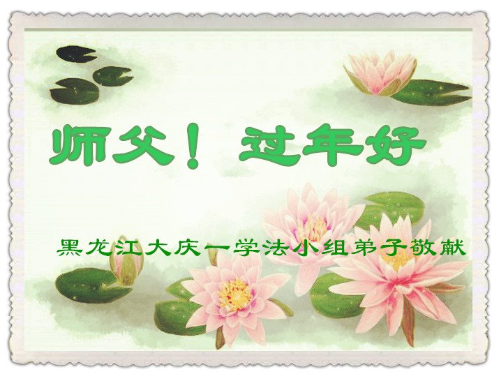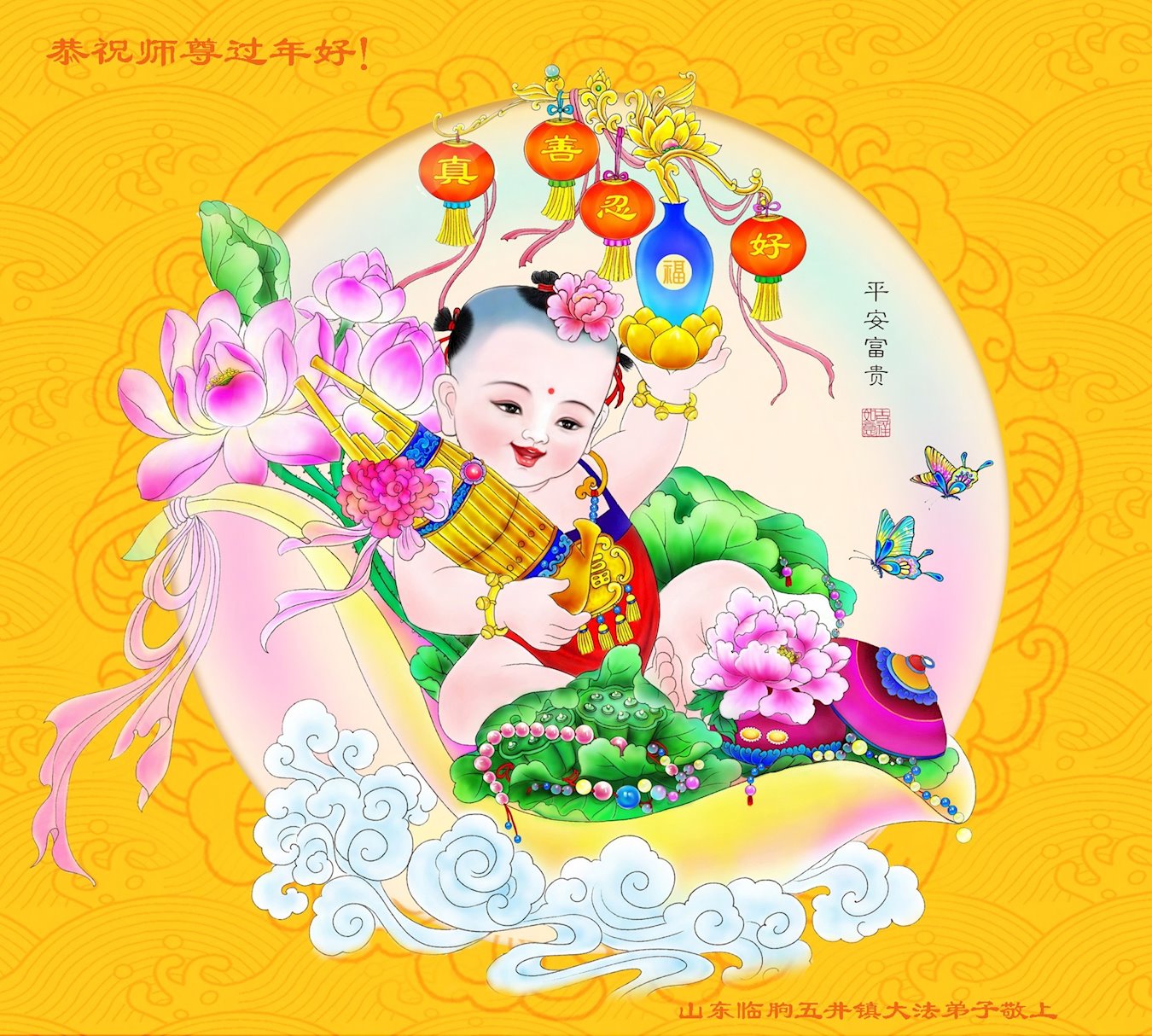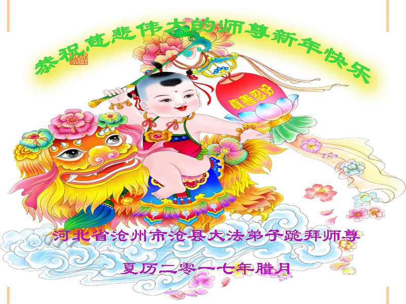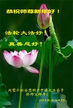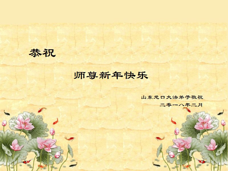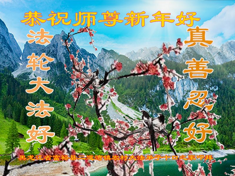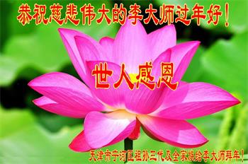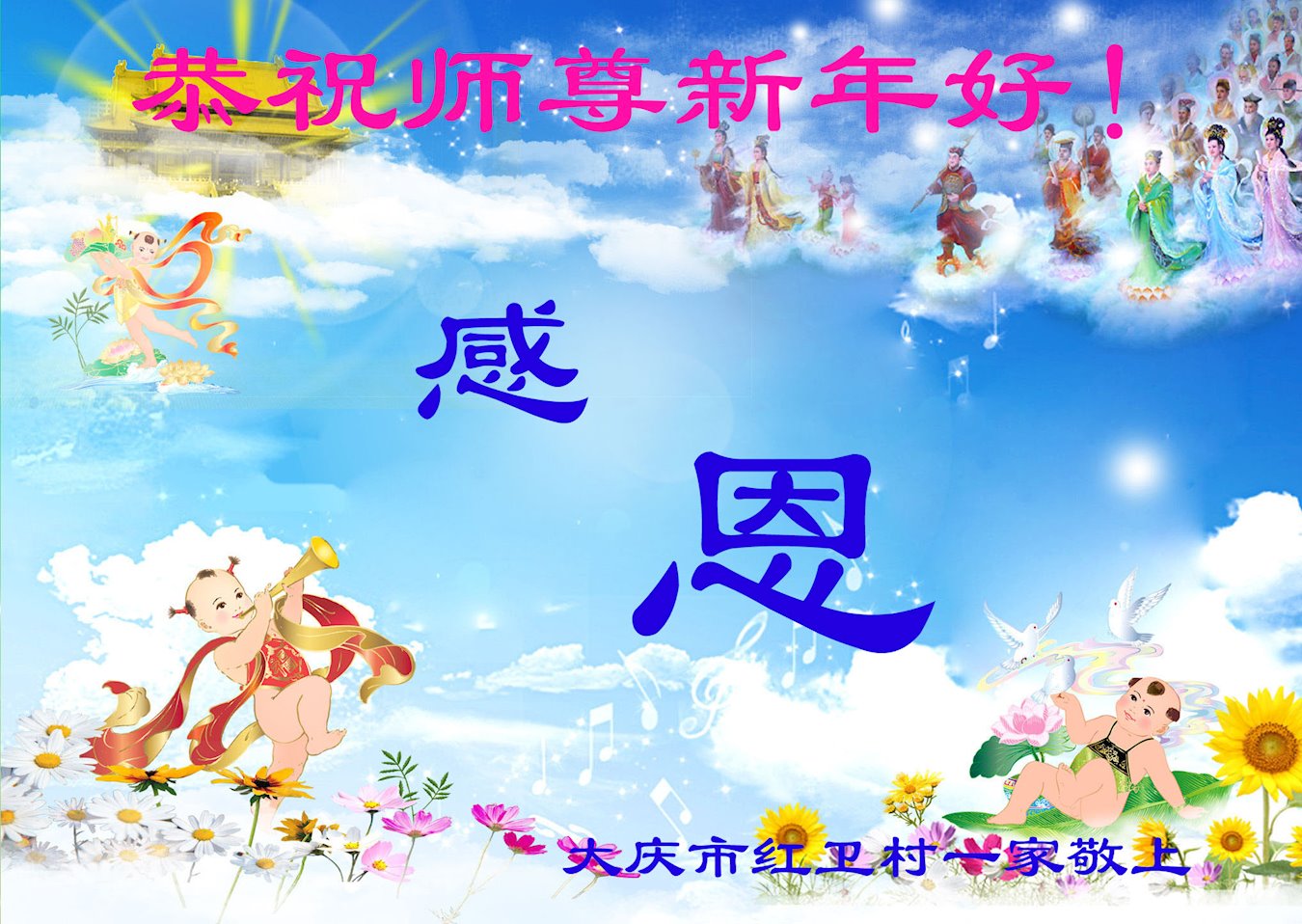 慈悲伟大的师父好!在这天地更新、万物复苏的时候,我们青岛东部的一资料点的全体老少大法弟子及家人给您拜年!恭祝师父新年快乐!借此,我们把满怀对慈悲伟大的师父的思念和感恩之心凝成一句话:学好法,修好心,不懈怠,多救人,路走正,报师恩,证实法!