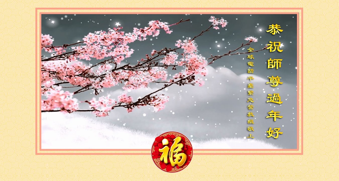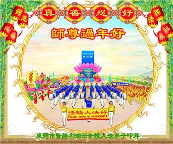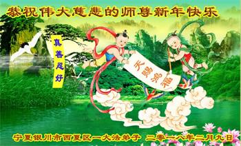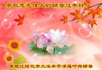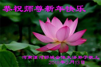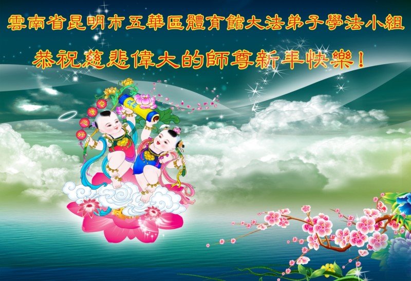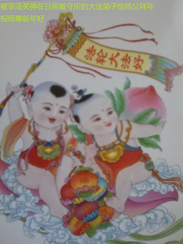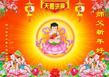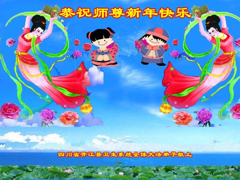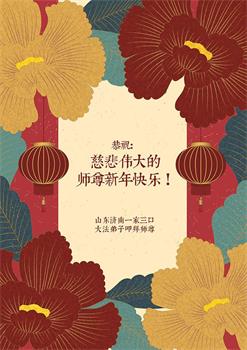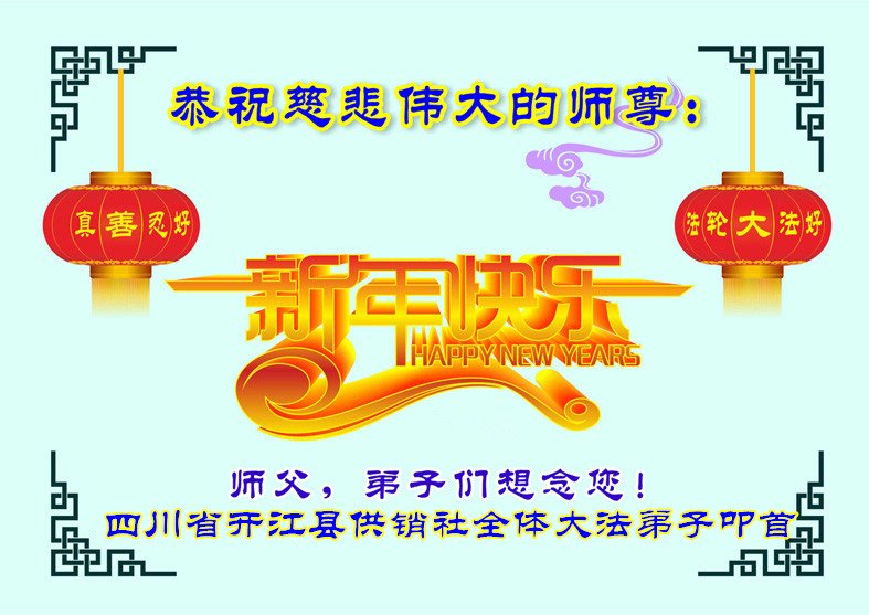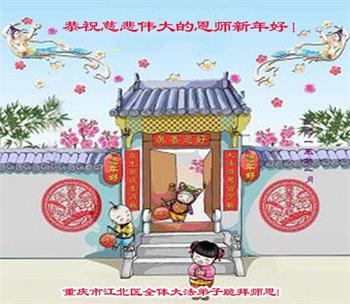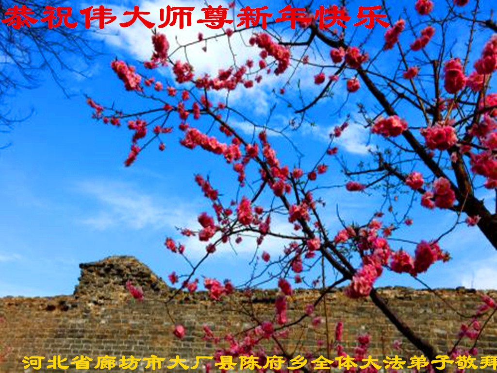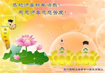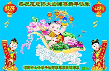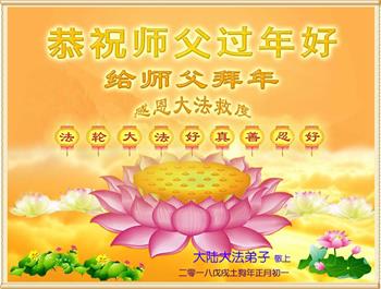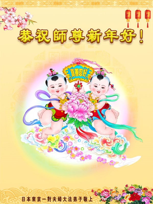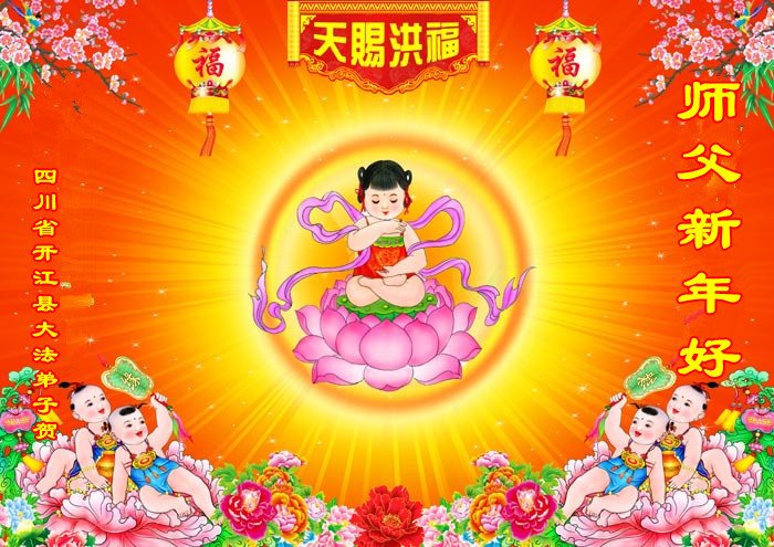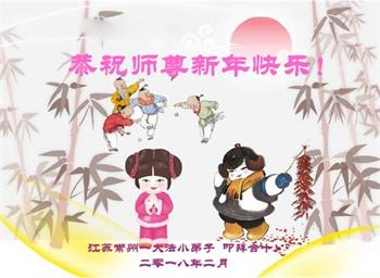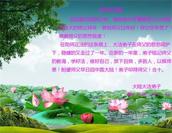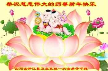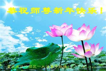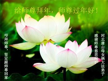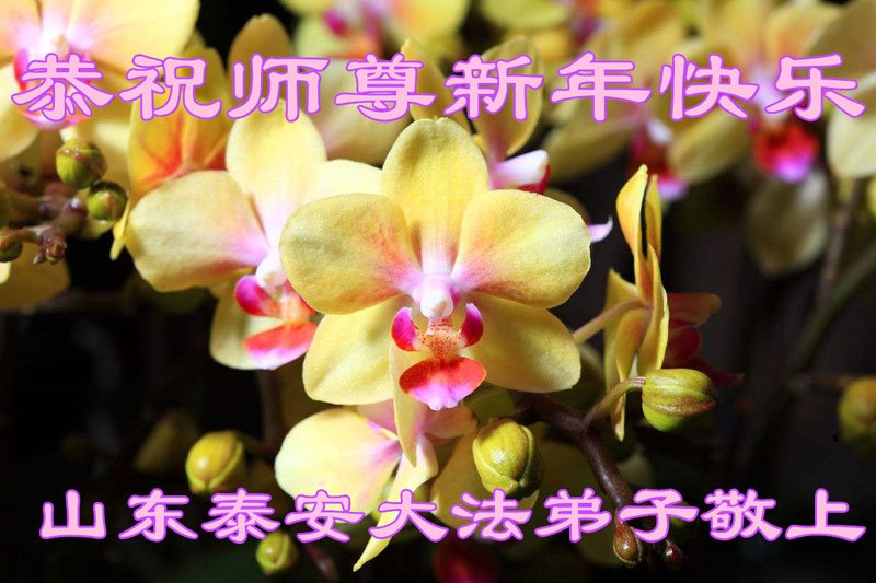 慈悲伟大的师父好!在这天地更新、万物复苏的时候,我们青岛东部的一资料点的全体老少大法弟子及家人给您拜年!恭祝师父新年快乐!借此,我们把满怀对慈悲伟大的师父的思念和感恩之心凝成一句话:学好法,修好心,不懈怠,多救人,路走正,报师恩,证实法!