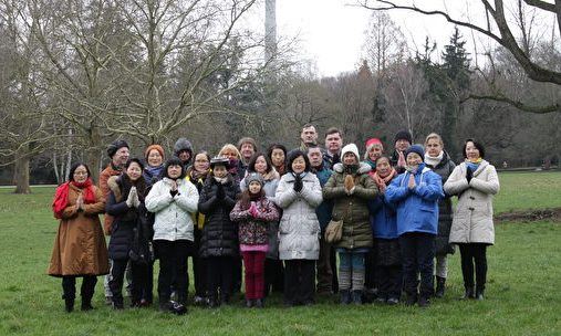 当日早上,在给师父拜年之前,法轮功学员在绿堡公园里伴着悠扬的音乐集体炼功。