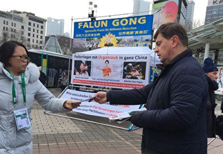 ![]() 二零一八年二月在法兰克福的一个展览会上,Vitali给中国展商发法轮功真相资料。 |