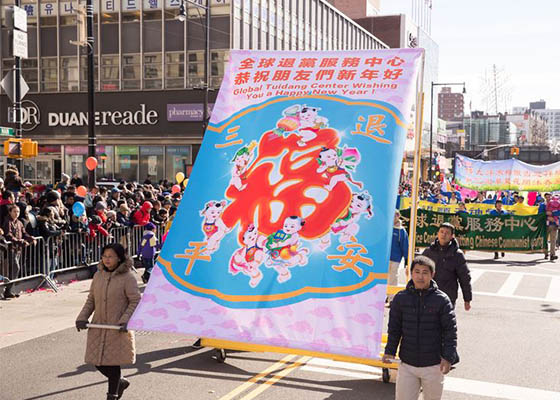 - 法拉盛戊戌年大游行 三退彩船送福(图)- 二月十七日大年初二,“全球退党服务中心”参加纽约法拉盛中国新年戊戌年大游行,给民众拜年、送福。