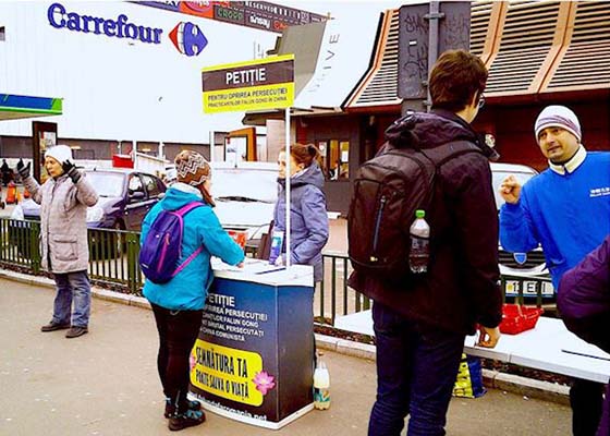 - 罗马尼亚学员新年在首都传播真相(图)- 二月十七日,中国新年大年初二,罗马尼亚学员在首都布加勒斯特市中心附近的大型综合超市前展示法轮功功法,派发真相传单。