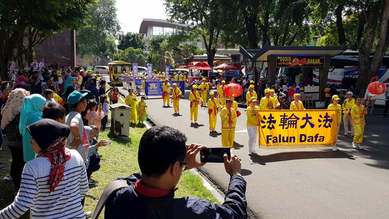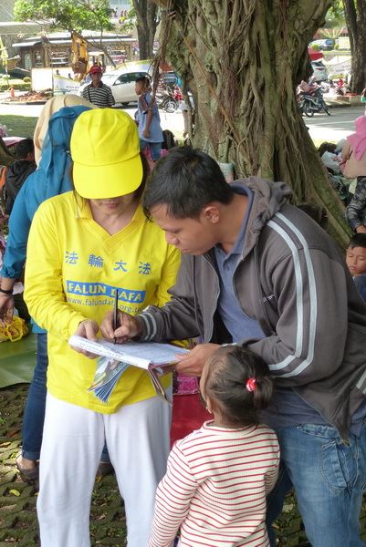 炼完法轮功五套功法之后,学员们开始游行,腰鼓队开路,接着是手举“真善忍”横幅以及“法轮大法在印度尼西亚”等牌子的队伍,许多游客拿出手机录下这美好的画面。不少游客兴奋地向学员要介绍法轮功的资料。了解到法轮功无辜遭受中共迫害的真相后,游客们纷纷签名,声援起诉迫害法轮功的恶首江泽民,希望能早日制止发生在中国的迫害。