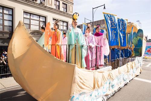 “全球退党服务中心”的大型横幅在前,双狮开道,退党彩船乘风破浪。一支长约十米的黄色月牙形的大船,船身是蓝白相间的祥云彩图,船头是天宫仙境中的亭台楼阁,船上站着身穿锦衣罗裙的“天女”;最醒目的是船上六面导航的蓝色大幡旗,旗帜上的金色大字 “退党”在阳光下熠熠生光。