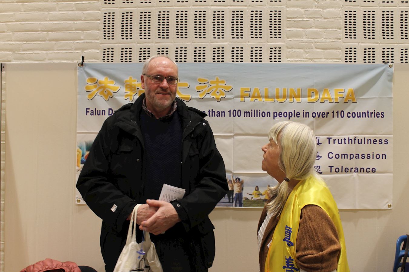 一位高个子、名叫耀恩·马努森(J?rgen Magnussen)的丹麦人来到了法轮功的展台前了解功法。年过花甲的马努森至今还没有出过丹麦的国门,甚至连瑞典也没去过,但他非常向往中国,看过很多关于中国的书和纪录片。当他来到法轮功展台时,他感觉每一位法轮功学员都很亲切。当他得知法轮功的书籍《法轮功》和《转法轮》具有博大精深的内涵时,当即买了这两部书,表示回家慢慢阅读,并会认真思考。他若有所思地说:“看来,是法轮功,我要好好看看。”他还期待自己有一天能通过学习法轮功,克服障碍,能走出丹麦去领略其他国家的风采,特别是能去看看中国。