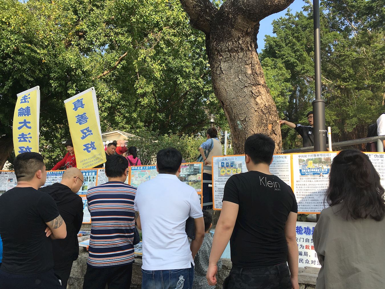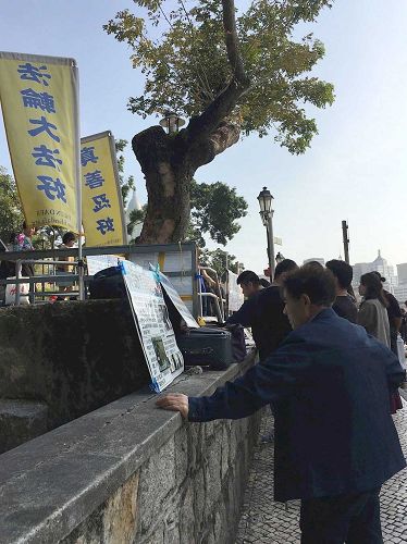 图1~4:中国大陆游客在澳门景点认真阅读法轮功真相展板