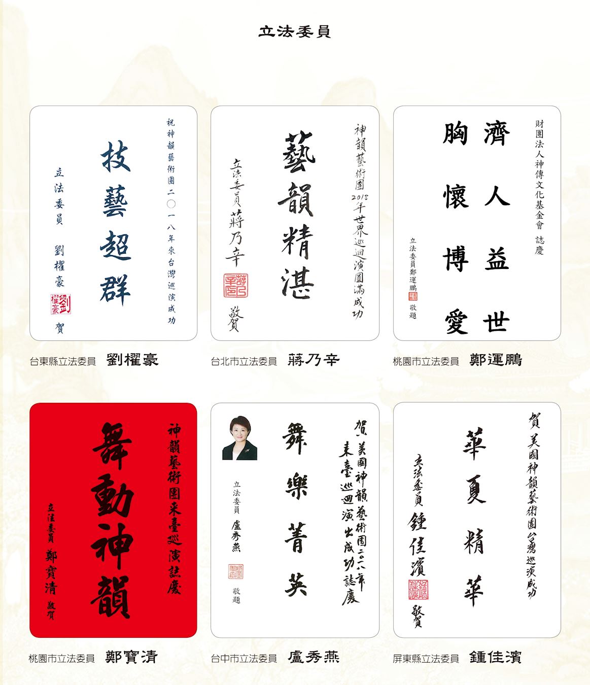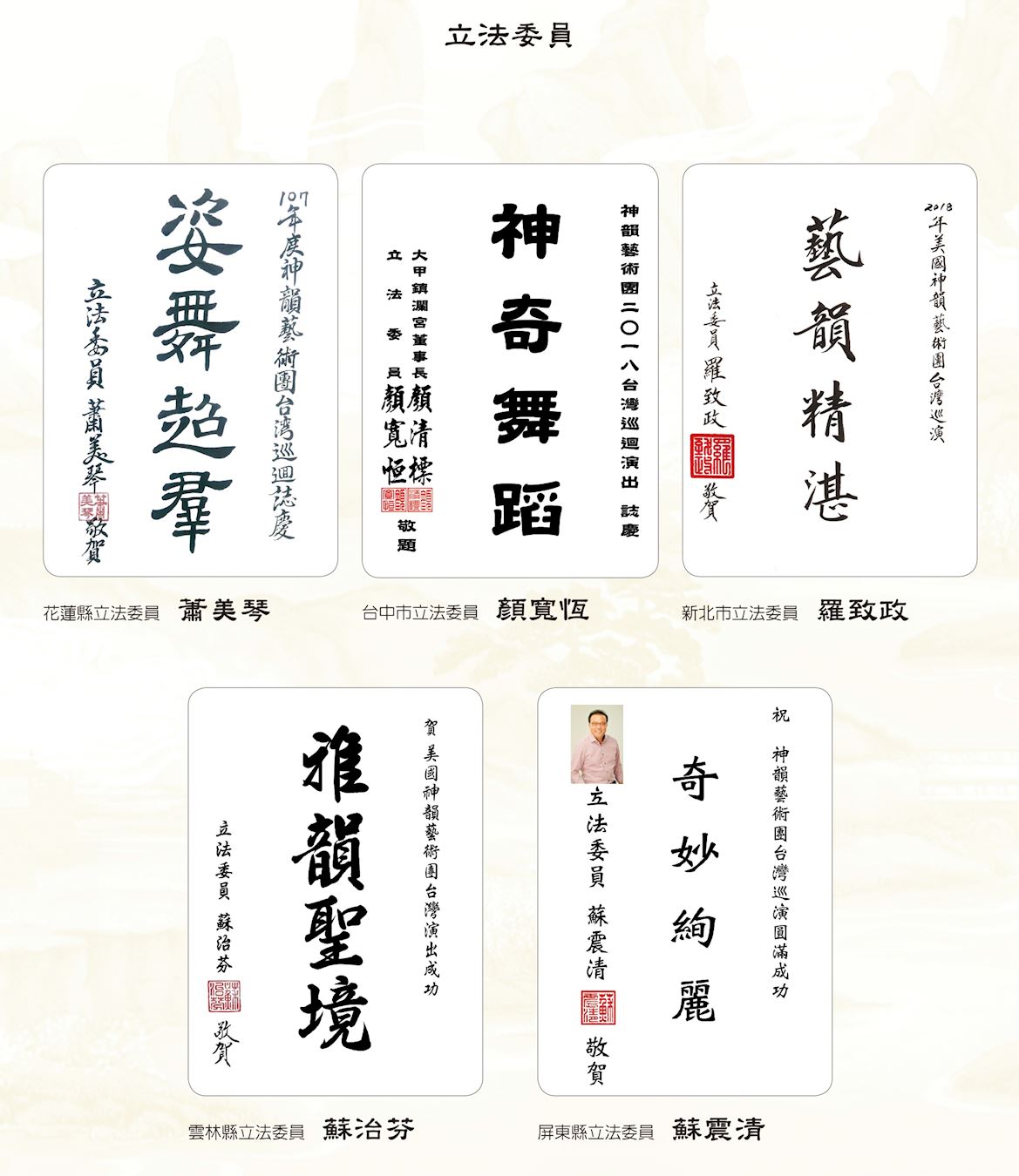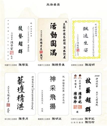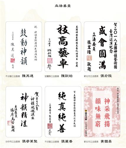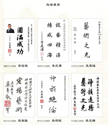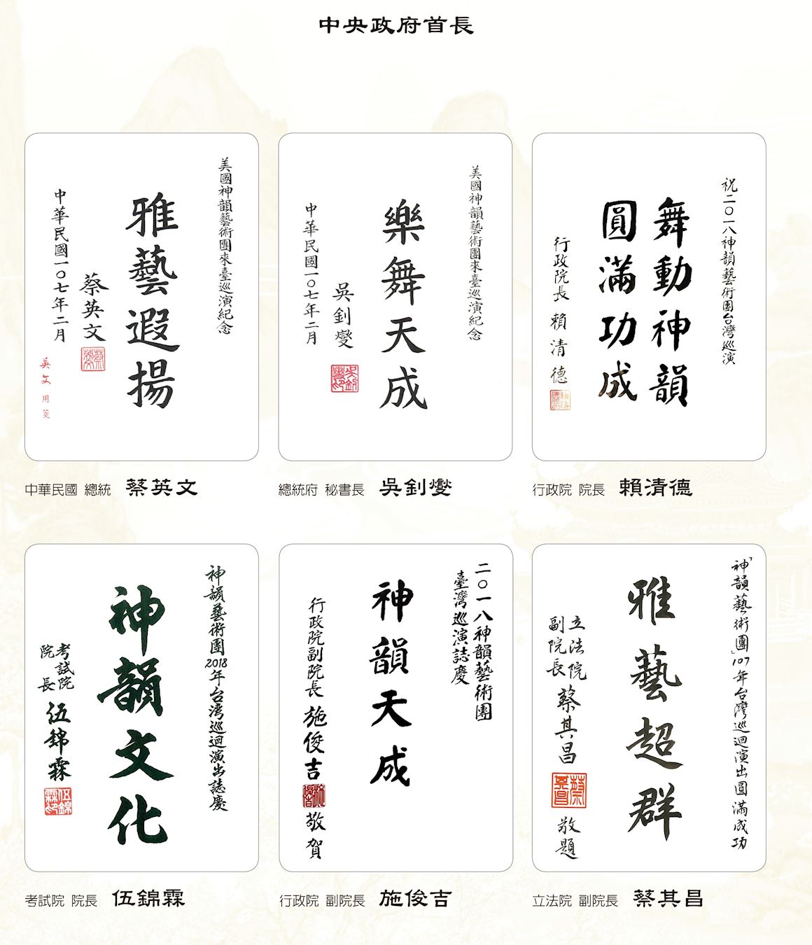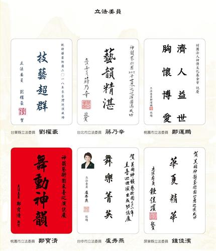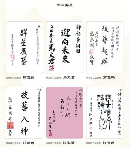 ![]() 图2:中华民国总统蔡英文、总统府秘书长吴钊燮、行政院长赖清德、考试院院长伍锦霖、行政院副院长施俊吉、立法院副院长蔡其昌赞扬神韵。 |