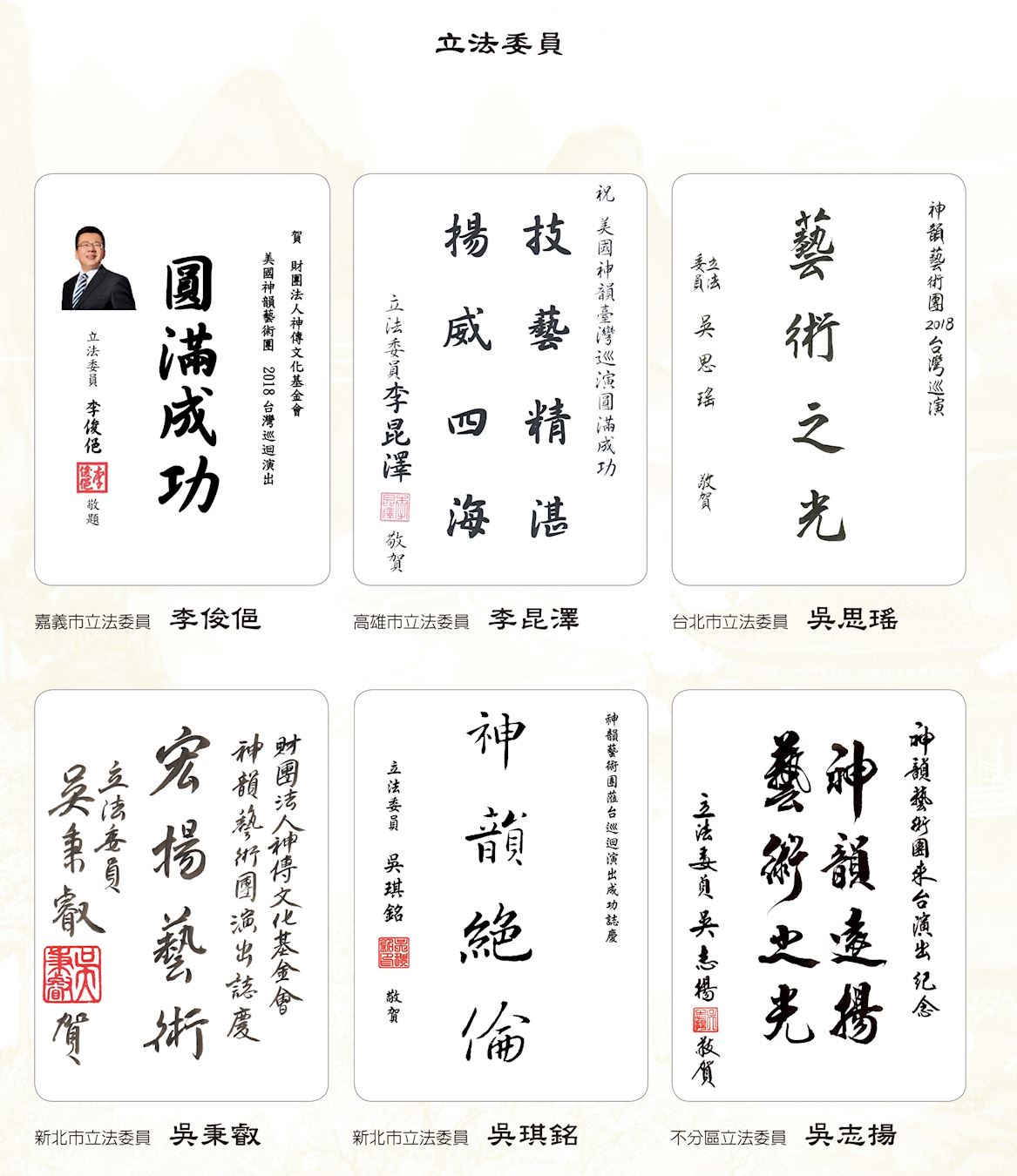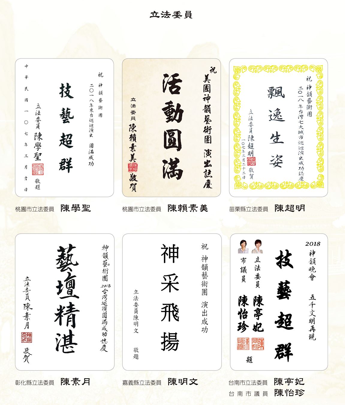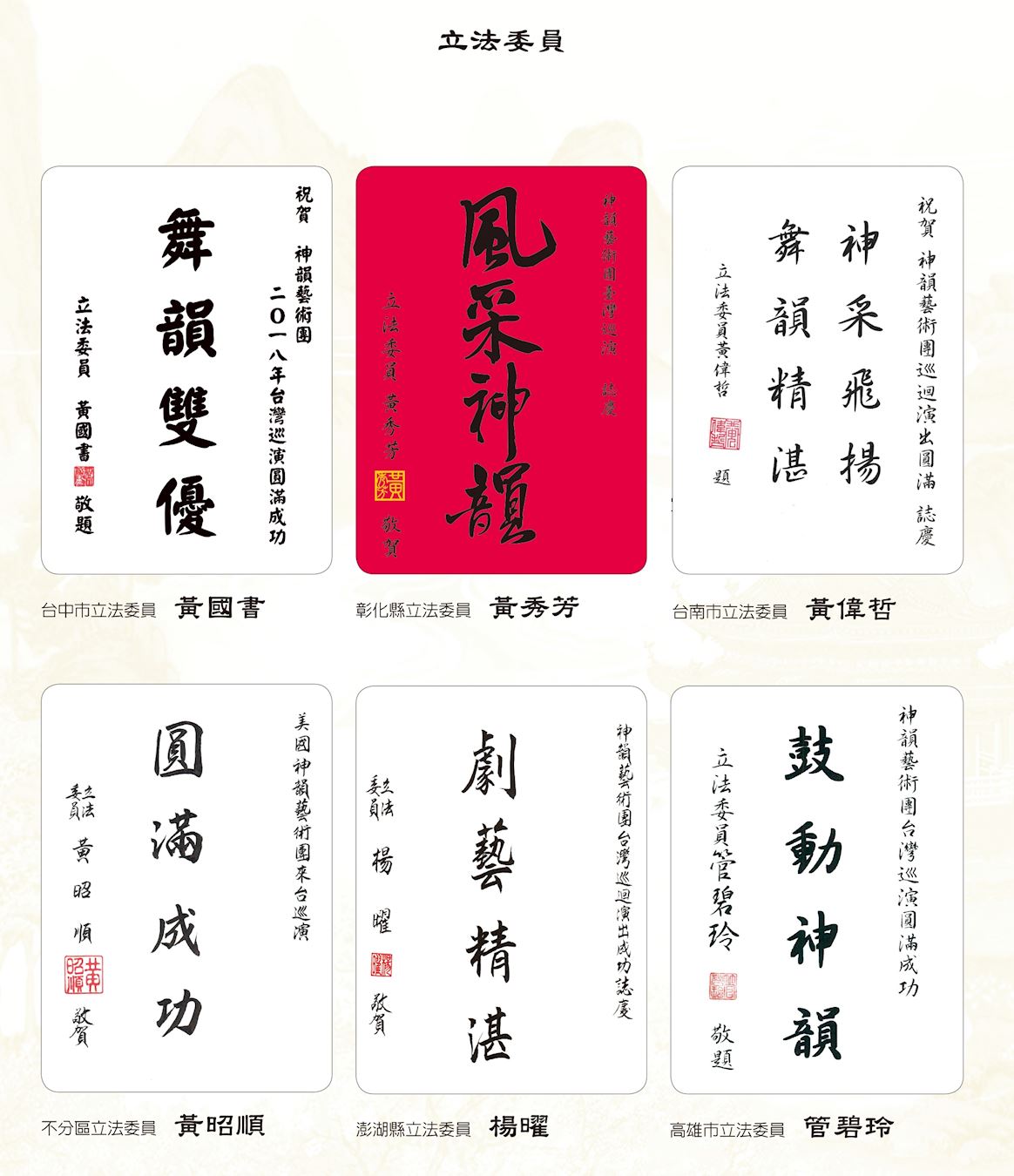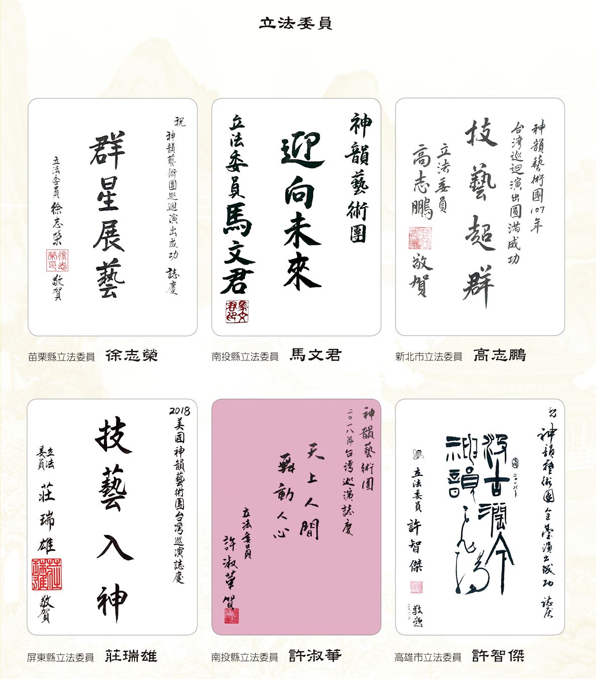 ![]() 图2:中华民国总统蔡英文、总统府秘书长吴钊燮、行政院长赖清德、考试院院长伍锦霖、行政院副院长施俊吉、立法院副院长蔡其昌赞扬神韵。 |