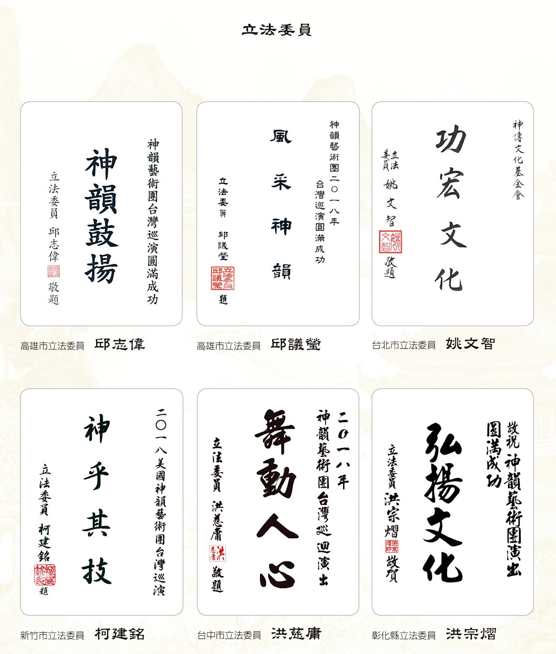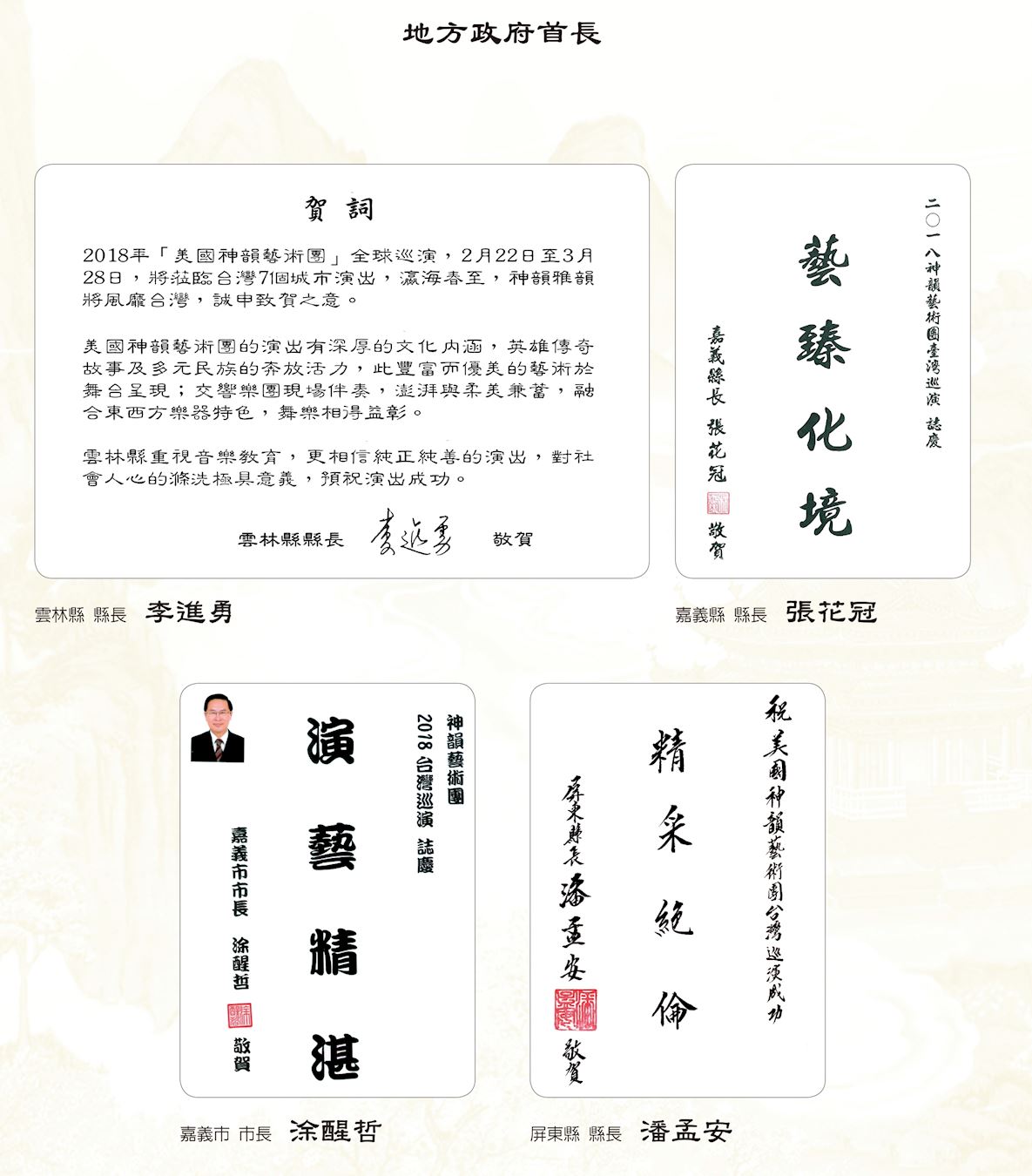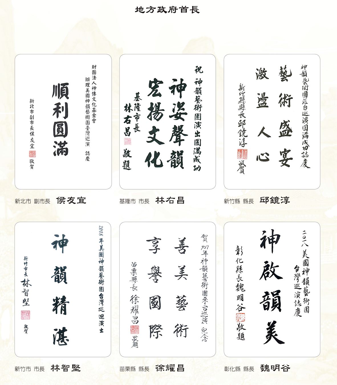 而新北市副市长侯友宜、基隆市长林右昌、新竹县长邱镜淳、新竹市长林智坚、苗栗县长徐耀昌、彰化县长魏明谷、嘉义县长张花冠、嘉义市长涂醒哲、屏东县长潘孟安、宜兰代理县长陈金德、澎湖县长陈光复、金门县长陈福海等地方县市长也纷纷以“气势磅礴 激荡生命”、“艺韵传神 名扬国际”、“神韵深远”、“音姿精湛”、”艺臻化境”、“演艺精湛”、“神韵再现 精彩绝伦”、“声韵俱佳”等贺词欢迎神韵莅临。