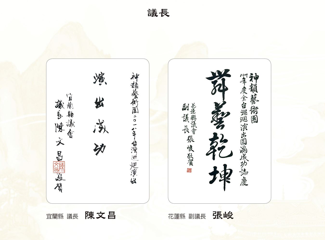 ![]() 图8:宜兰县议长陈文昌、花莲县副议长张峻祝贺神韵演出成功。 |