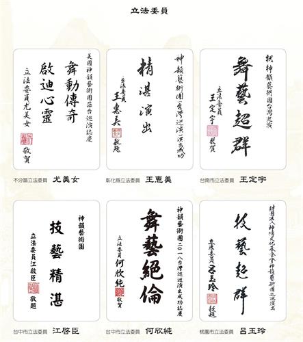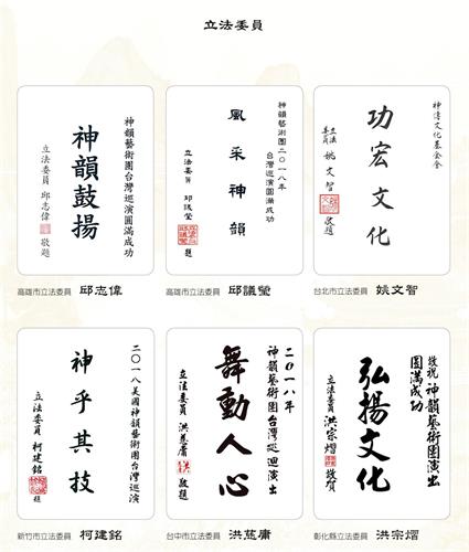 神韵在台湾开演前夕,近百位各级首长政要,纷纷发出贺文和贺词,欢迎十二度莅临台湾演出,对神韵用精湛的艺术形式,复兴中华传统文化的使命,给予热情的褒奖和祝贺。