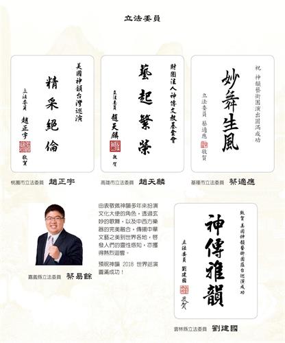 ![]() 图4:各城市市长包括新北市长朱立伦、桃园市长郑文灿、台中市长林佳龙、台南市长代理市长李孟谚等都代表市民发出贺文,恭迎神韵访台。 |