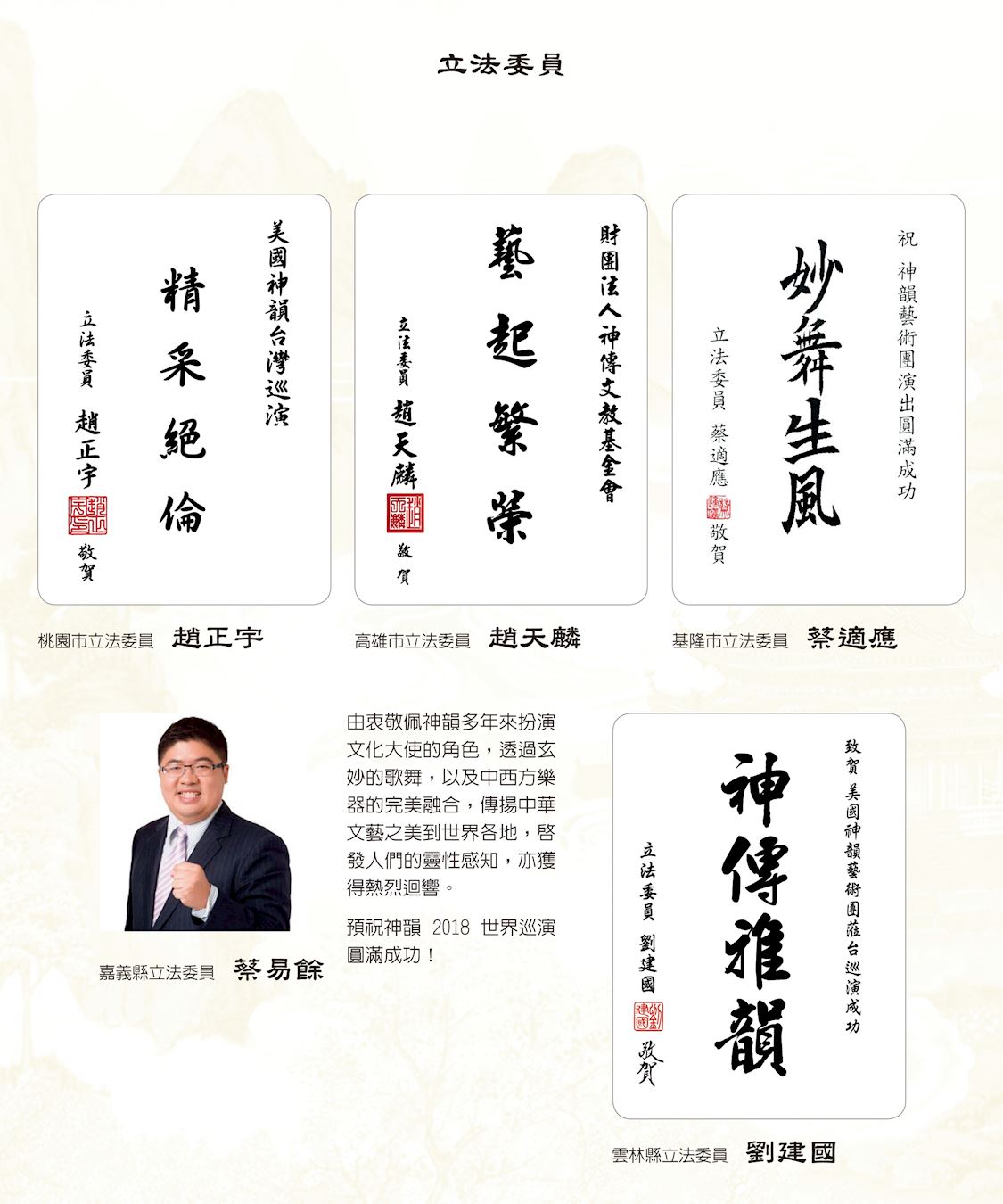 嘉义县立委蔡易余说,由衷佩服神韵多年来扮演文化大使的角色,透过玄妙的歌舞,以及中西方乐器的完美融合,传扬中华文艺之美到世界各地,启发人们的灵性良知,并获得热烈回响。