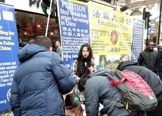 - 在伦敦唐人街传播法轮功真相(图)- 在伦敦唐人街,法轮功学员向大家展示了法轮功五套功法,同时,也讲述十八年来法轮功在中国无辜遭受迫害的事实,并为制止中共活摘器官而征签。