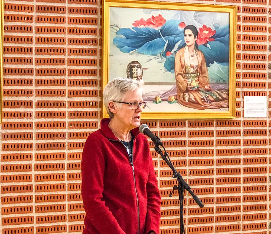 维碧珂女士为开幕式致词,她祝画展成功,建议大家花点时间都来看看这个以法轮大法为主题的画展,在了解当今中国的法轮大法修炼者无辜遭受迫害的真相的同时,还可以去分享中国历史悠久、古老传统灿烂的文化,从画展中吸取知识,见识不同文化下的生活。